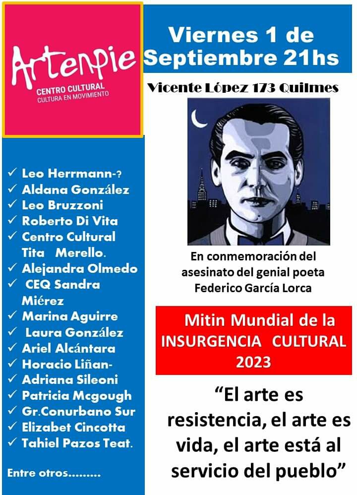 El viernes 1, en Artenpié, la icónica casa de Arte de Quilmes Oeste, habrá varias expresiones para homenajear a Federico García Lorca, el poeta junto al que se asesinaron muchas ilusiones de una generación en España.