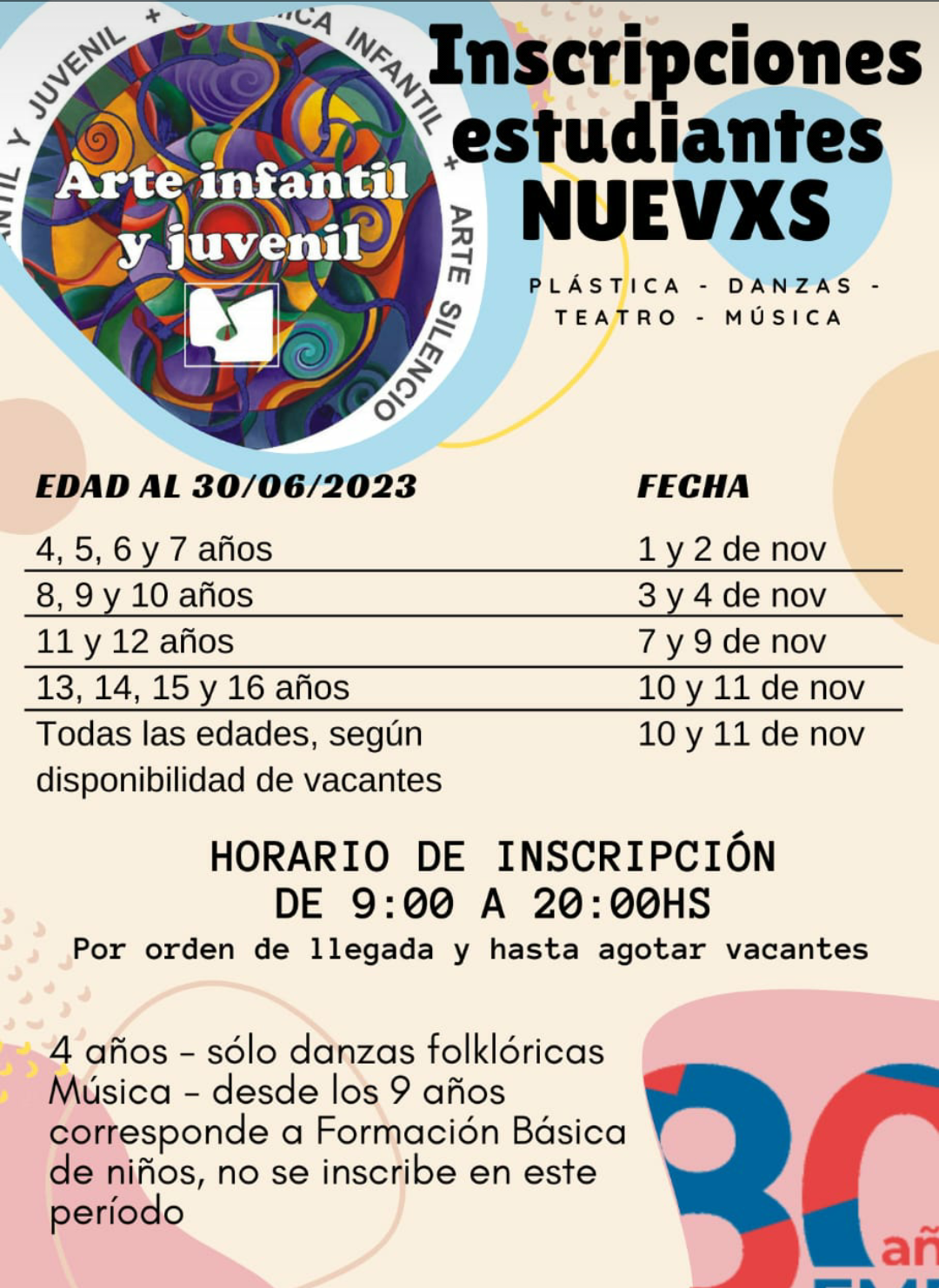 Un éxito total!! Se agotaron las vacantes de 5 a 10 años. Para plastica música teatro y danzas infantil. El lunes inscribimos las edades de 11. 12 y 13 años. También para juvenil chicos de 13 a 17 años