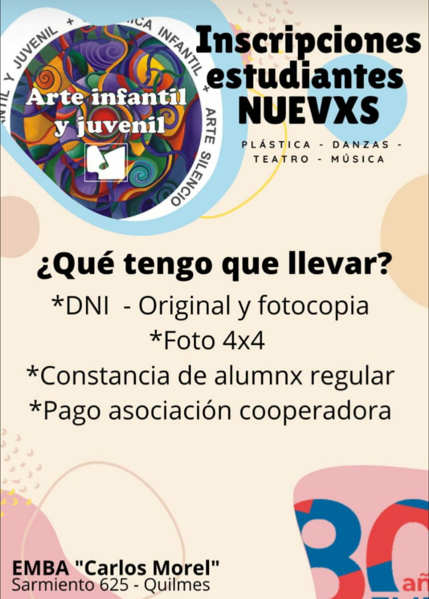La Escuela Municipal de Bellas Artes Carlos Morel abrió su inscripción para arte Infantil y Juvenil. Informate si quedan vacantes en: inscripcionesemba@gmail.com