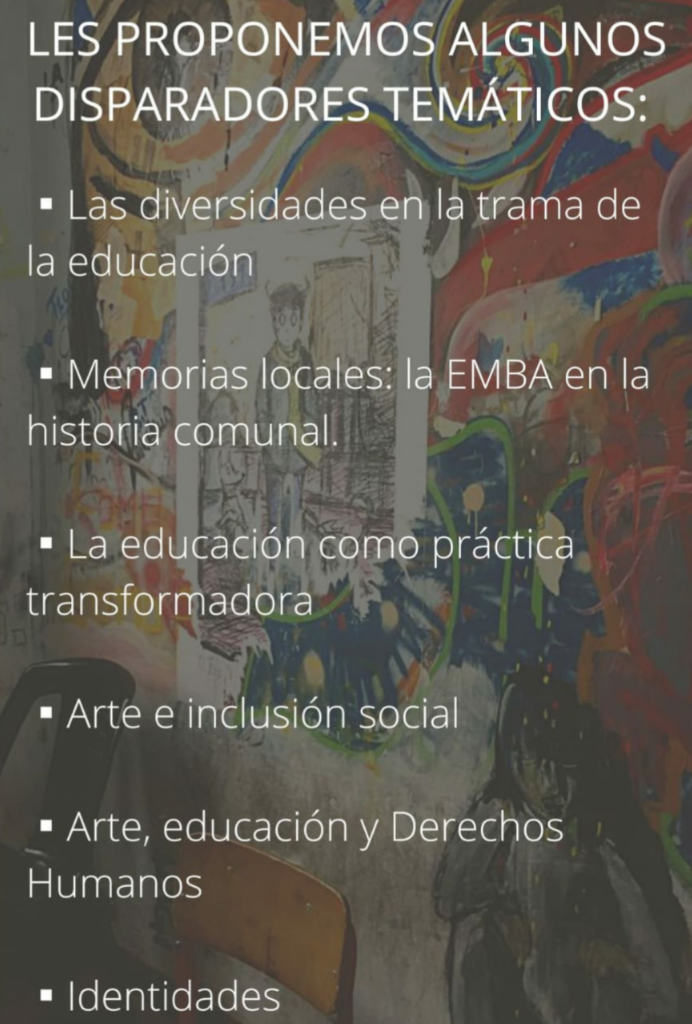 La comunidad educativa de la EMBA, su Departamento de Extensión Cultural, Dirección General; la Dirección de Arte Público y Muralismo, Secretaría de Educación, y Secretaría de Cultura y Deportes del Municipio, invitan a artistas individuales y colectivxs de arte a presentar proyectos destinados a la intervención de la fachada.