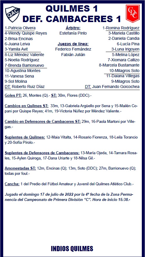 Ruíz Díaz movió el banco de suplentes, en los ingresos de Mailén Copani y Gabriela Argüello el entrenador buscó gol pero no lo obtuvo. Cambaceres se adueñó del partido y en los minutos finales, del balón y los últimos ataques.