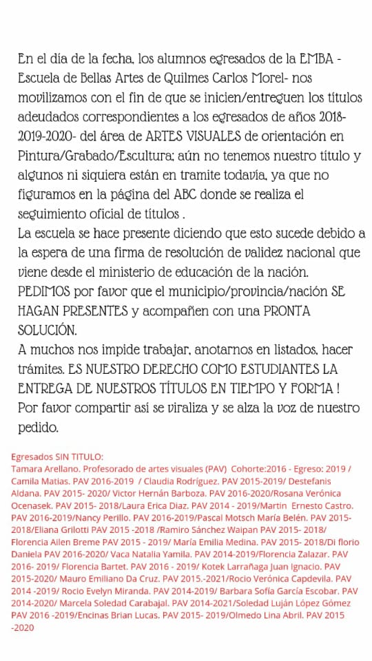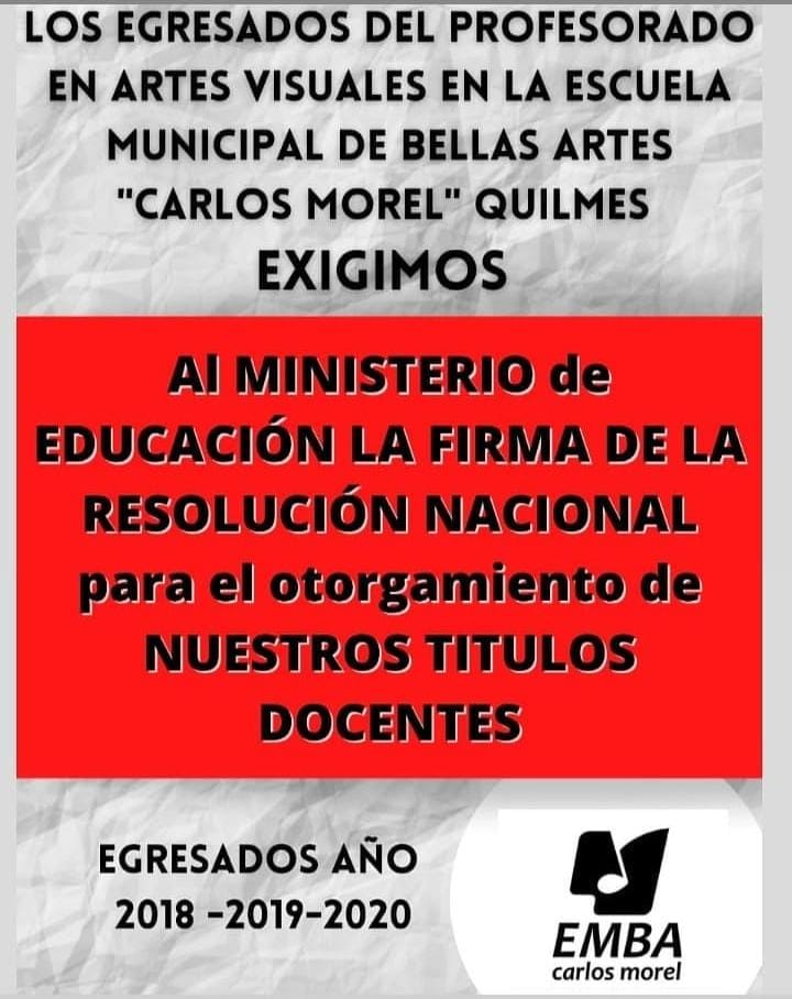 Egresados de los profesorados de la Escuela Carlos Morel manifiestan mediante un comunicado que se ven impedidos de trabajar en su profesión.