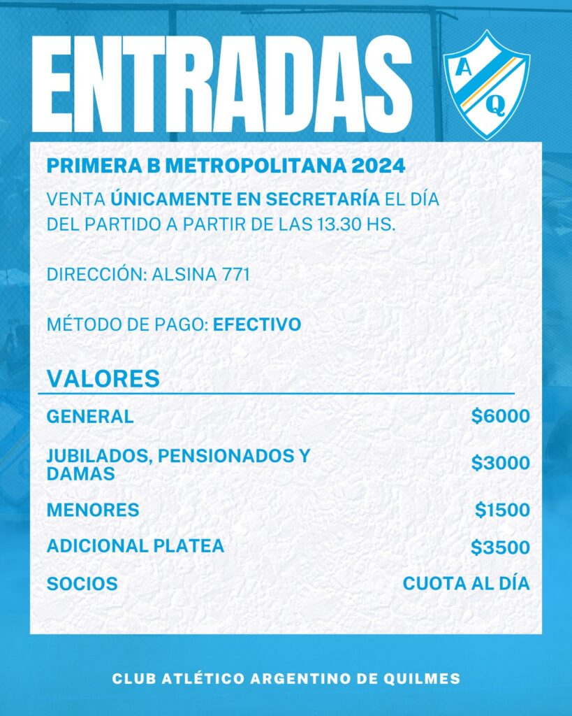 Los boletos se compran, como es habitual, en la secretaría del Club Atlético Argentino de Quilmes. Los socios criollos entran gratis a la popular y deben pagar el adicional para acceder a una mejor visión desde la platea techada.