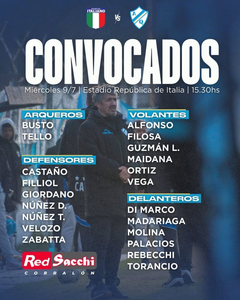 El posible once para enfrentar al Tano es: Tello; Fillol, Giordano, Castaño y Tomás Núñez; Leandro Guzmán, Filosa, Vega, Molina y Ortiz; Torancio. El resto de los convocados está integrado por Busto, Velozo, Demian Núñez, Zabatta, Alfonso, Maidana, Di Marco, Madariaga, Palacios y Rebecchi.