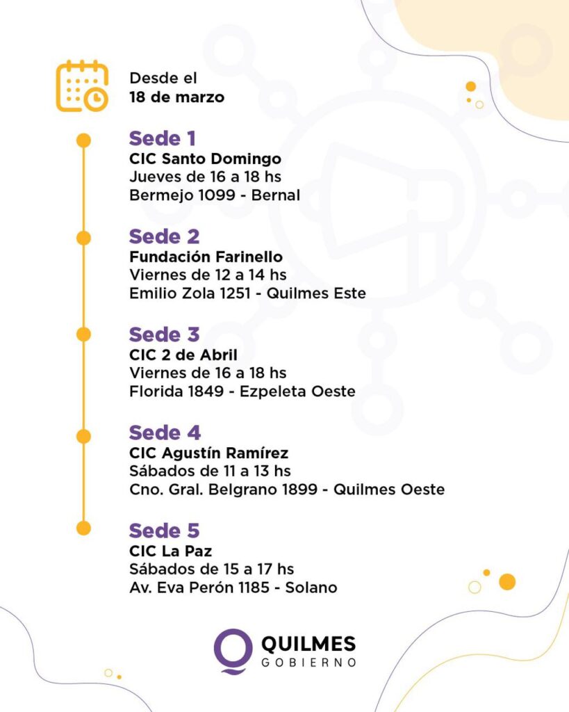 Los encuentros presenciales se realizarán una vez por semana, sosteniendo una capacidad limitada y los cuidados frente al COVID 19, en cinco sedes que dispuso el municipio en Quilmes Este, Ezpeleta Oeste, Bernal, barrio La Paz y Quilmes Oeste. La inscripción ya está disponible y se realiza en este enlace.