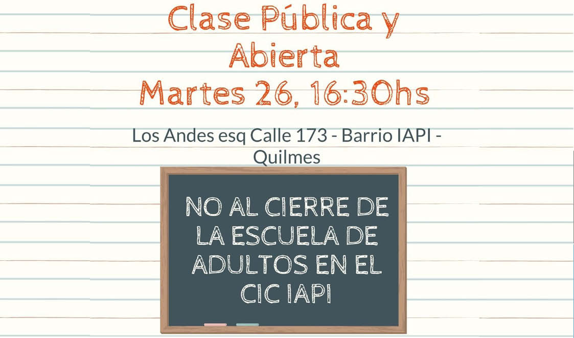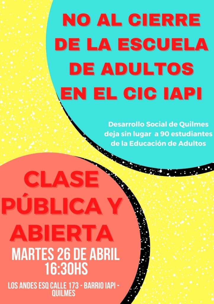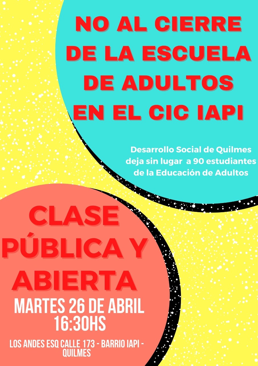 Se cumple el plazo de diez días para abandonar el espacio del CIC, dictaminado por Desarrollo Social del Municipio (y por la directora del CIC, Julia Galván). Reclamamos que el municipio recapacite y deje funcionar a la Escuela de Adultos (que hace más de quince años funciona allí), al FINES y al CENS en el CIC de IAPI, un lugar digno para estudiar y capacitarse.