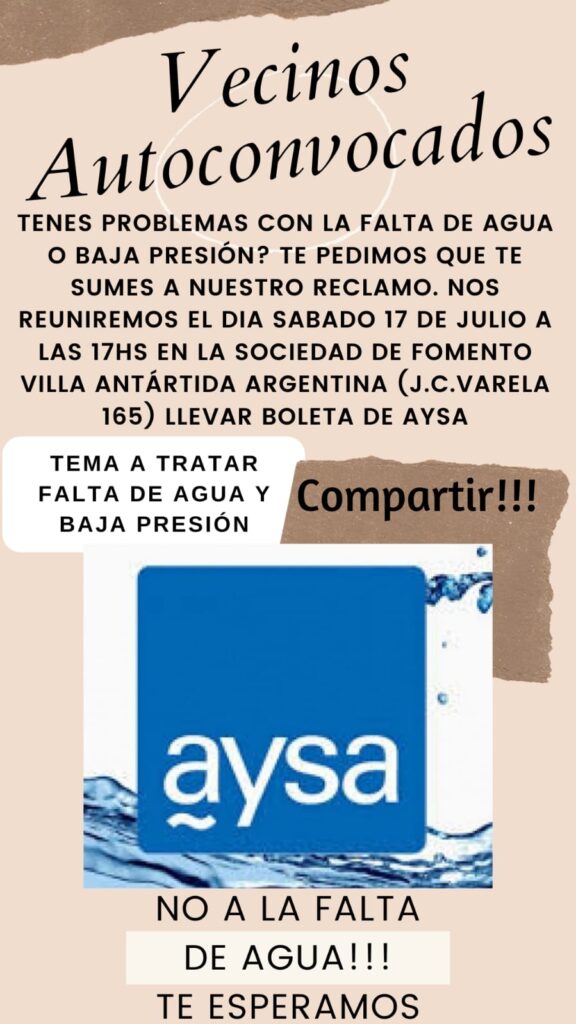 Por mi parte voy a ver si se le puede hacer alguna denunica a esos de Aysa , cortan cuando quieren , por más que en algunos lugares digan tal día cortan para arreglar , cortan y después no pasa nada ,No sale agua o tenemos poca presión , yo estoy muy cansada , mis padres de más de 80 años , este verano y invierno también , sufrieron la falta de agua descaradamente , con eso digo todo .