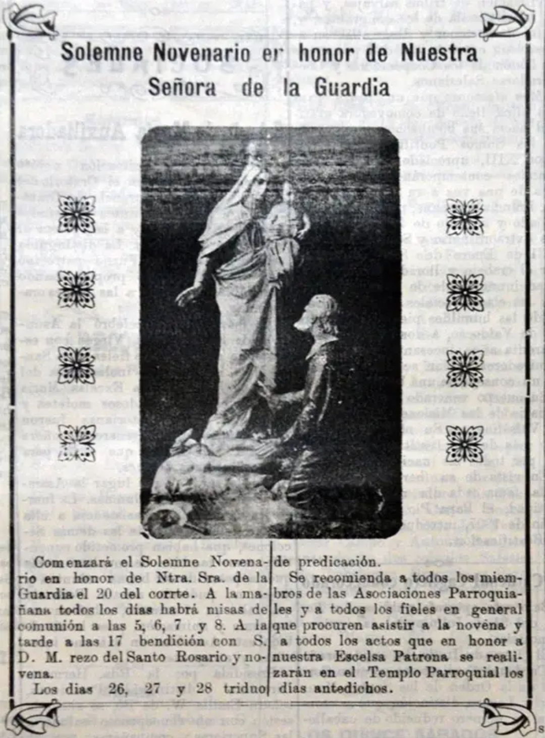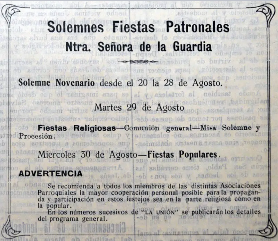 Y llegamos así al martes 29, Día de Nuestra Señora de la Guardia, el que fue recibido con una salva de bombas y dianas ejecutadas por la banda de música del colegio salesiano. Previo a la misa cantada de las 9.30 horas hubo una misa de Comunión donde muchas mujeres y jóvenes se acercaron a recibirla y oír el sermón del padre Correa Llano. La misa cantada fue oficiada por el padre Luis Pedemonte, hijo dilecto de Bernal y en ese momento Inspector Salesiano en la Patagonia, quien lo hizo con sublime maestría según las crónicas. Luego del almuerzo ofrecido por el párroco a los miembros de las agrupaciones parroquiales en el comedor del colegio, tuvo lugar la procesión, que fue restringida debido al mal tiempo que lamentablemente comenzaba a hacer de las suyas. La Virgen fue llevada hasta el frente del templo parroquial (en ese momento ubicado aún en Belgrano y Don Bosco, lo que hoy es el teatro), donde se congregó la multitud para oír a las bandas del Regimiento7 de Infanteria y del colegio mientras el padre Correa Llano impartía la bendición. «Una vez dentro del templo el padre dirigió a la muchedumbre una entusiasta arenga llena de piedad, de fe y saludables consejos, según cuenta el semanario parroquial La Unión«.