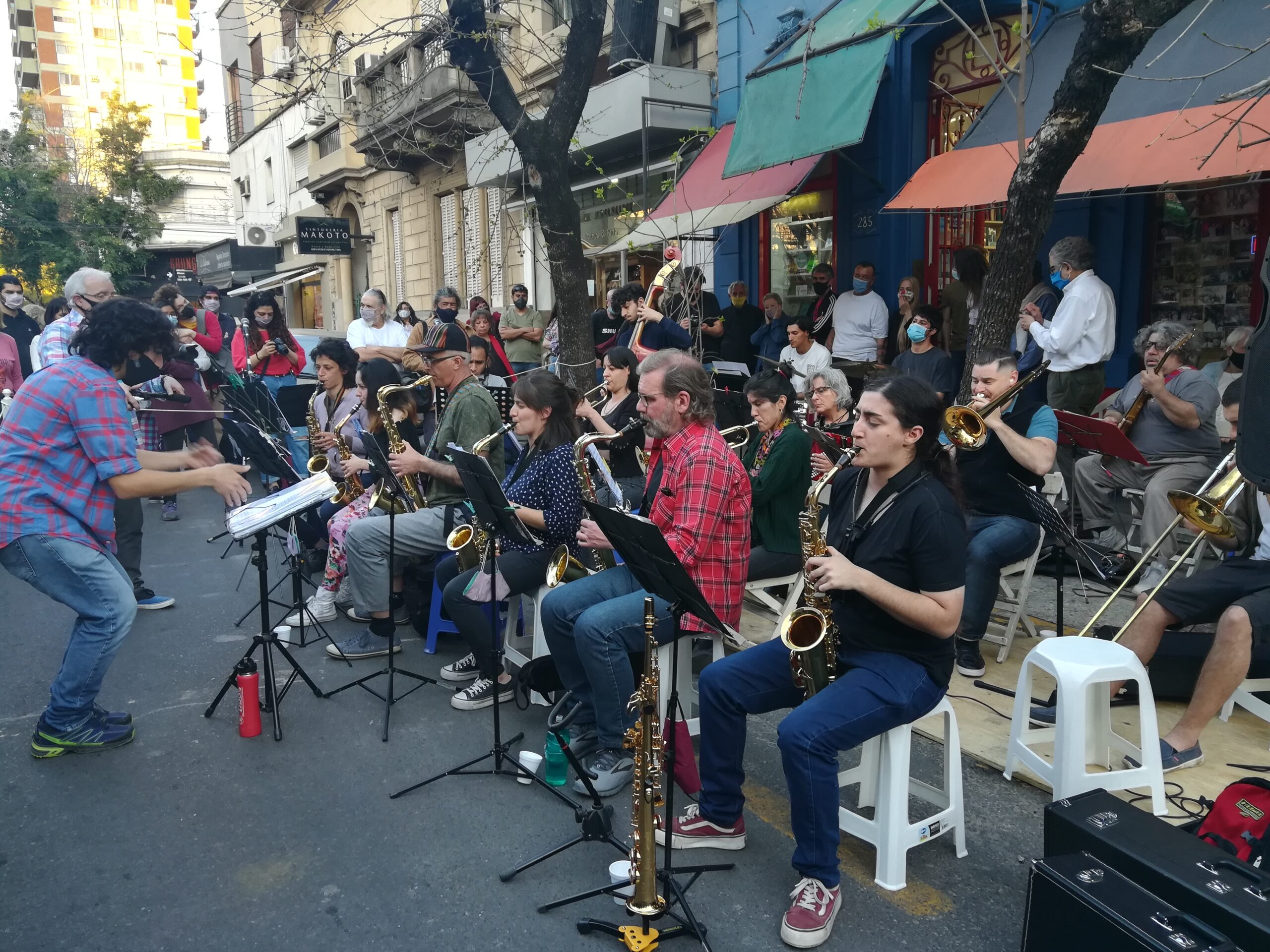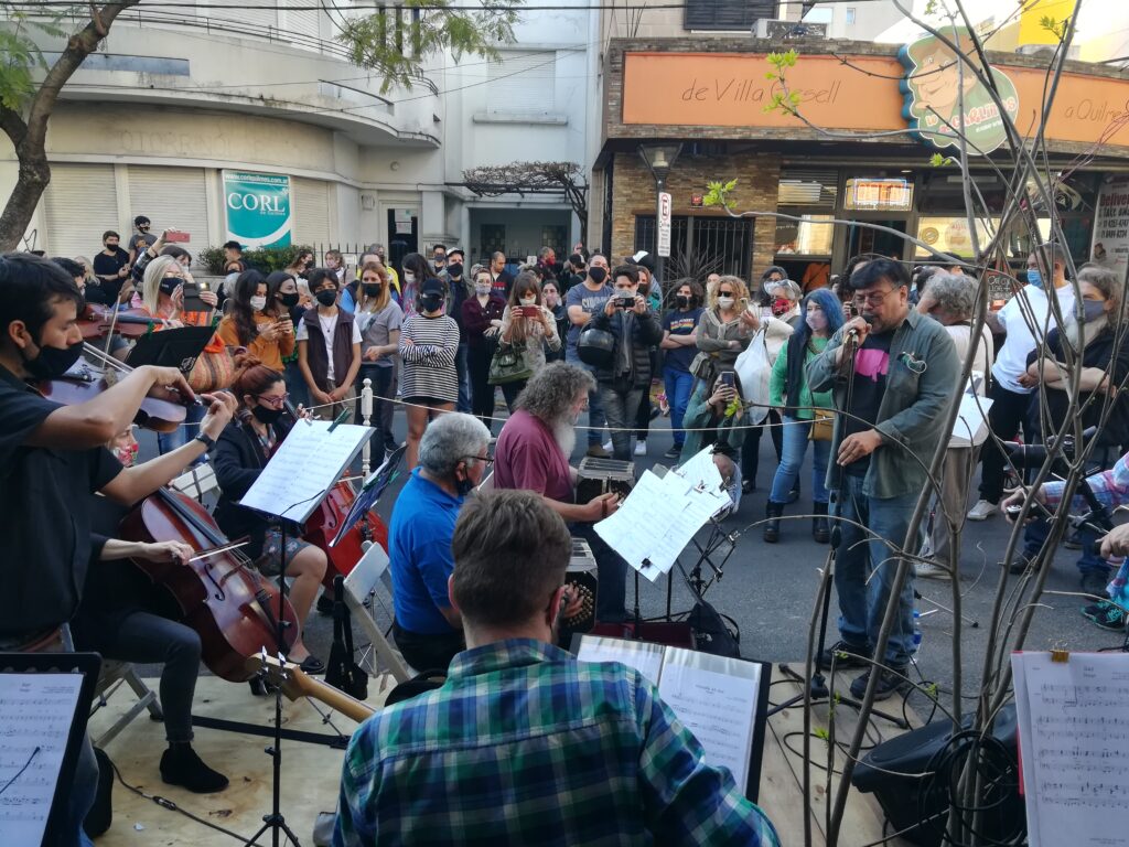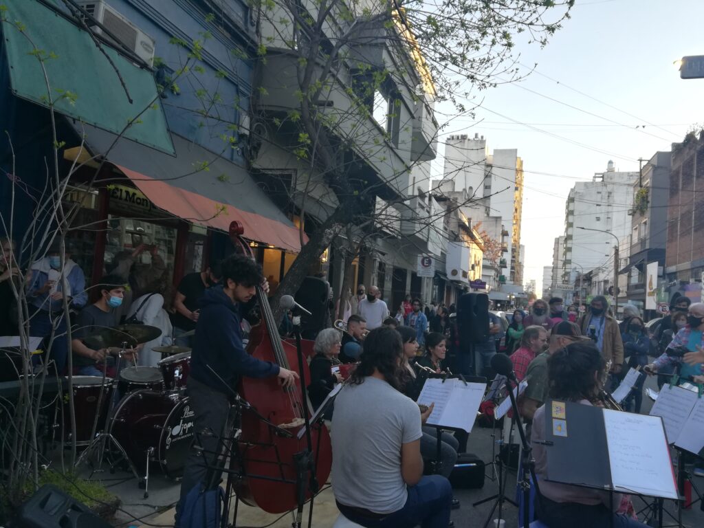 La librería El Monje, sobre la calle Alsina, festejó sus 50 años con las orquestas autogestivas del Club Mitre. El público disfrutó y bailó con música y cantantes y una expo de arte dentro del local con trabajos de Mariano Marchesini.