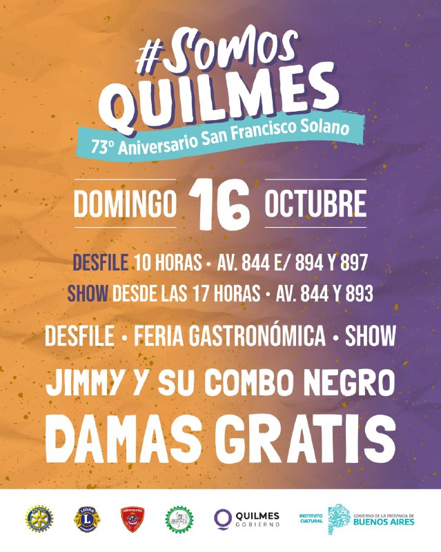 La celebración comenzará a las 10, con el tradicional desfile de instituciones sobre la avenida 844 entre 894 y 897; y seguirá, desde las 17, con shows en vivo. Pasarán por el escenario distintos artistas y grupos musicales locales y nacionales, entre los que se destacan Jimmy y su Combo Negro (cumbia) y el cierre con la histórica banda liderada por Pablo Lescano, Damas Gratis.
