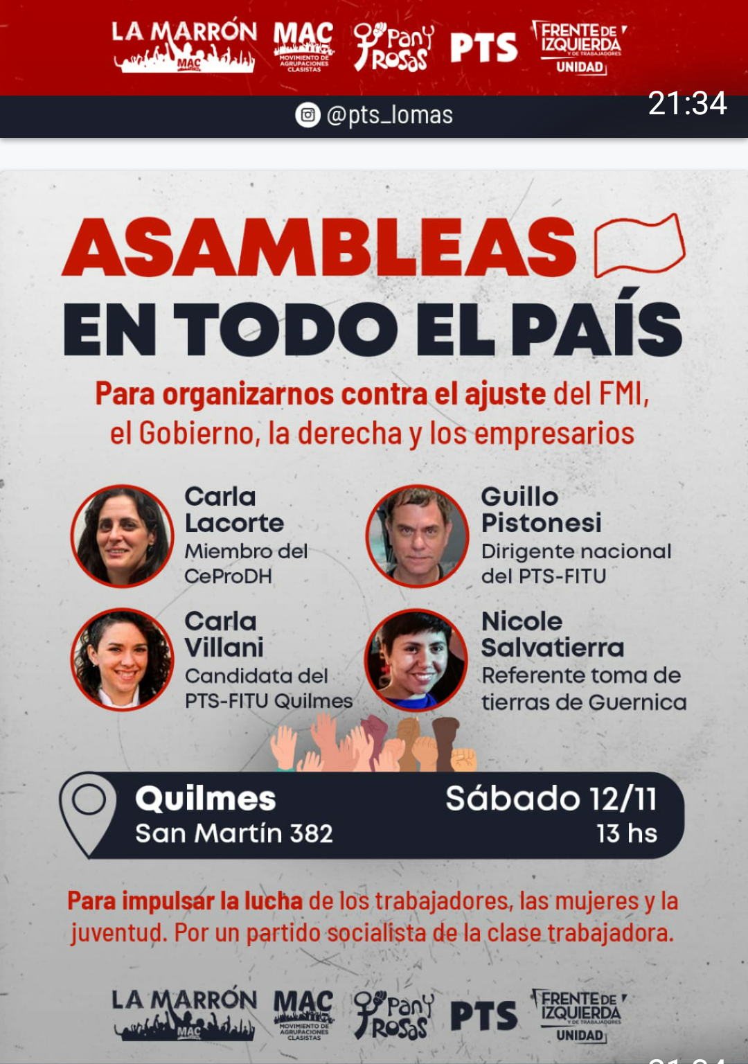 «Serán más de 100 asambleas en las principales ciudades y barrios populares de casi todo el país, una iniciativa con la que buscamos organizar una importante fuerza militante que sea protagonista, apoyando y fortaleciendo las luchas de las y los trabajadores como residentes y concurrentes que pelean por sus demandas más elementales, contra el ajuste y en defensa de la salud pública. Vamos a proponer una intensa campaña para lograr un gran encuentro nacional de trabajadores y trabajadoras que se reúna en un estadio y ponga en pie una coordinadora nacional para que las distintas luchas se unan y triunfen, para enfrentar el ajuste del FMI sostenido tanto por el gobierno como por la oposición de derecha. Los trabajadores del neumático comenzaron a marcar el camino. La dirigencia sindical nos condujo a este desastre, donde la inflación se come salarios y jubilaciones, queremos construir un polo alternativo”
