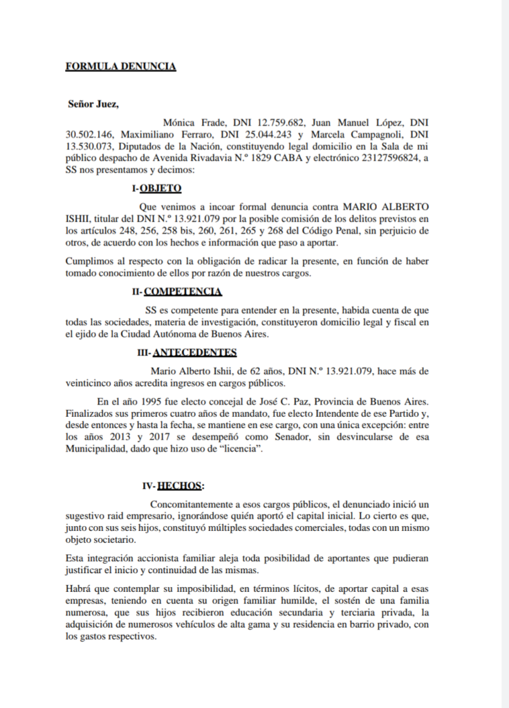En el día internacional contra la corrupción, la diputada nacional Mónica Frade denuncio en el fuero penal al intendente de José C. Paz, Mario Ishii, por los delitos de cohecho y tráfico de influencias, malversación de caudales públicos, negociaciones incompatibles con el ejercicio de funciones públicas y exacciones ilegales.