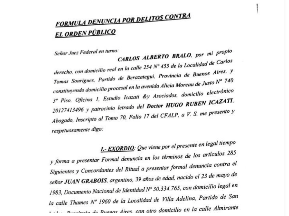 El abogado quilmeño Hugo Icazzatti es el patrocinante de la denuncia formulada por un vecino de Berazategui, Carlos Bralo, quien pide al Poder Judicial investigar al dirigente social Juan Grabois por “apología del delito e instigación a cometer delitos», figuras contempladas por el artículo 213 del Código Penal.