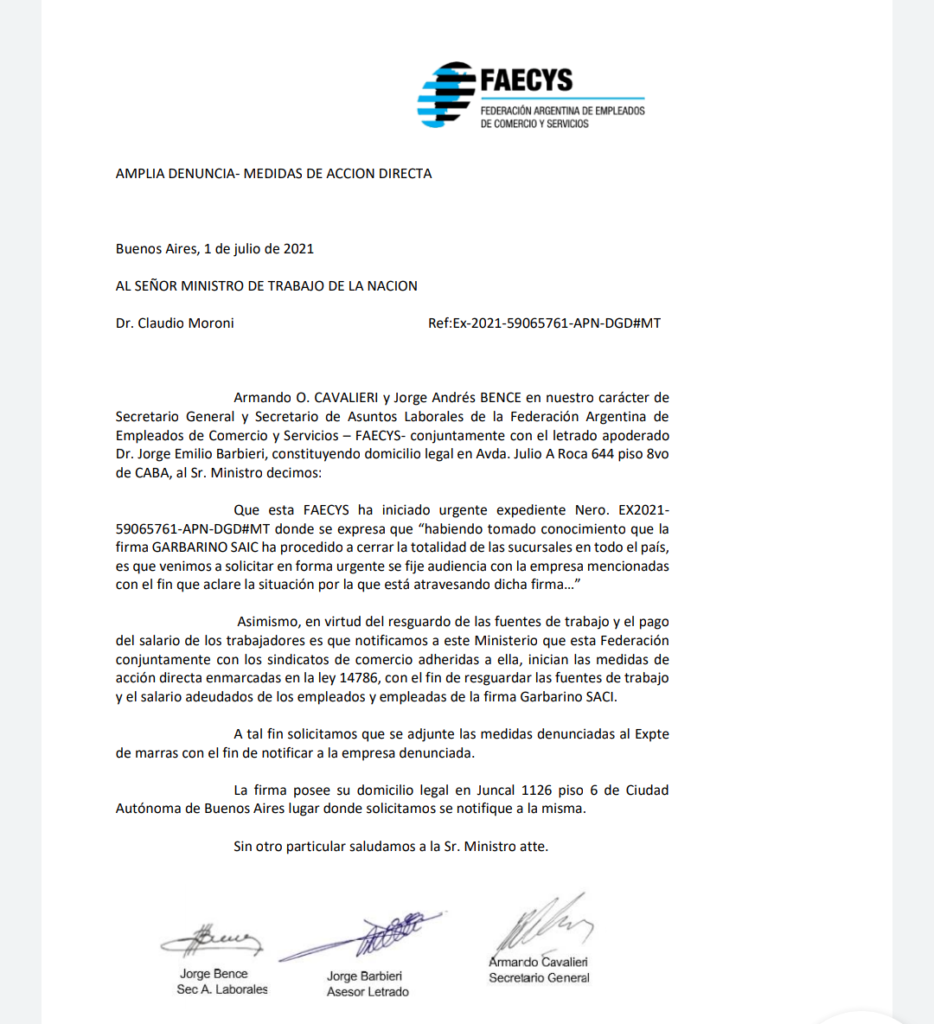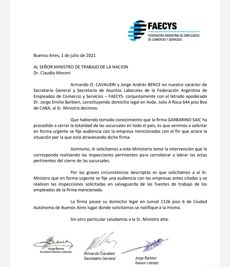 «La problemática está siendo tratada por el departamento legal de la Federación Argentina de Empleados de Comercio y Servicios (FAECyS), y el Ministerio de Trabajo de la Nación. Seguimos en estado de alerta y movilización a la espera de mantener los puestos de trabajo y aguardando novedades pronto».