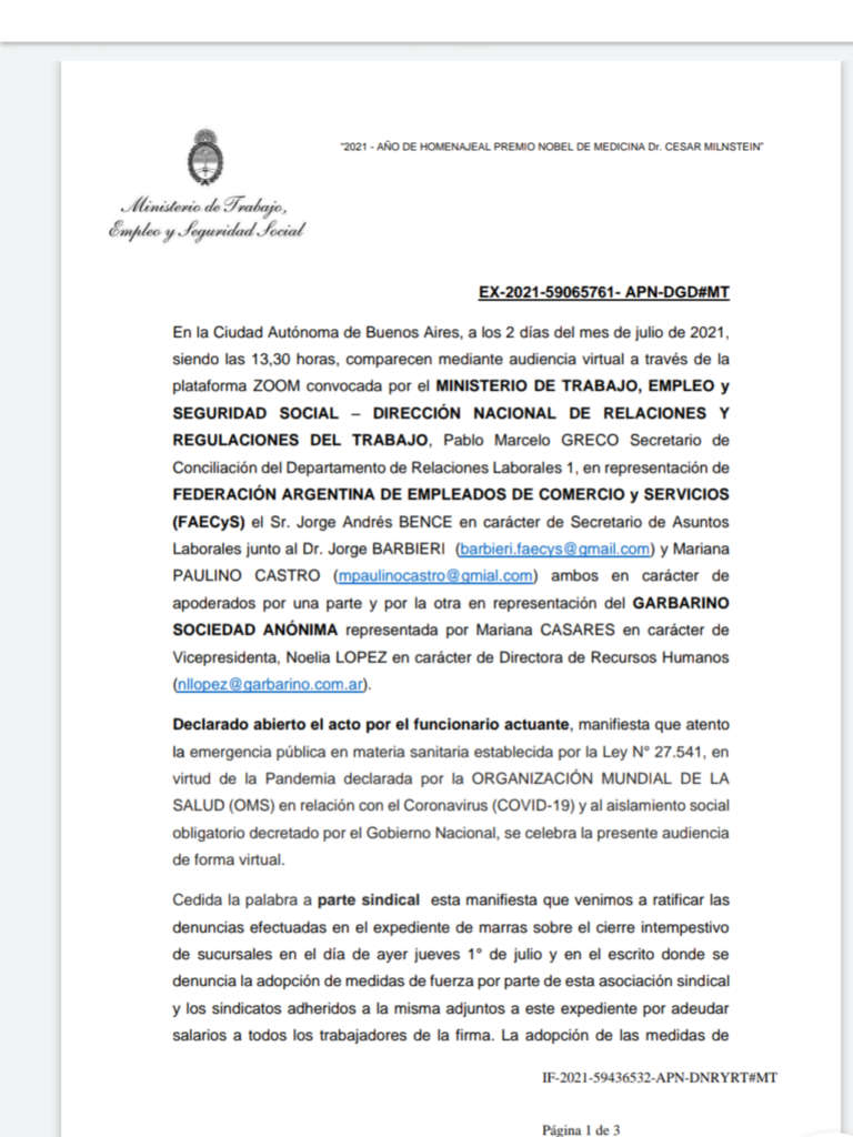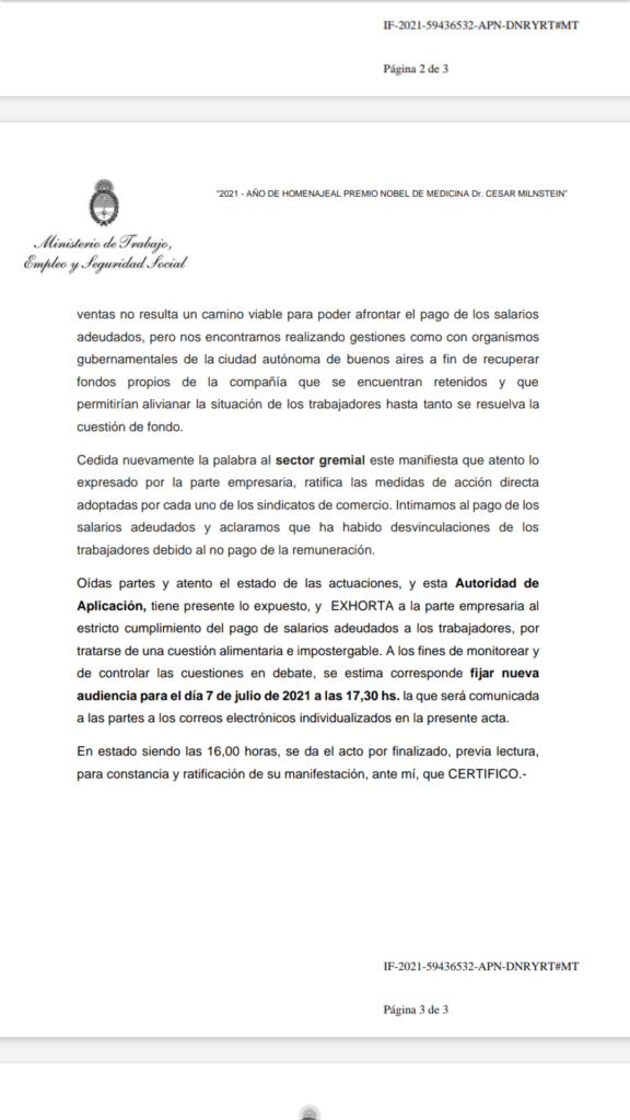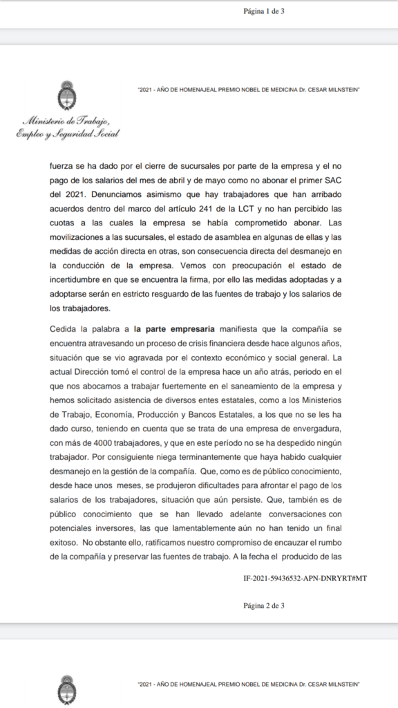 «La problemática está siendo tratada por el departamento legal de la Federación Argentina de Empleados de Comercio y Servicios (FAECyS), y el Ministerio de Trabajo de la Nación. Seguimos en estado de alerta y movilización a la espera de mantener los puestos de trabajo y aguardando novedades pronto».