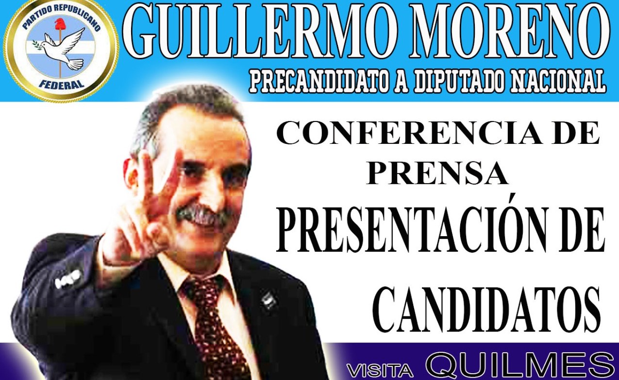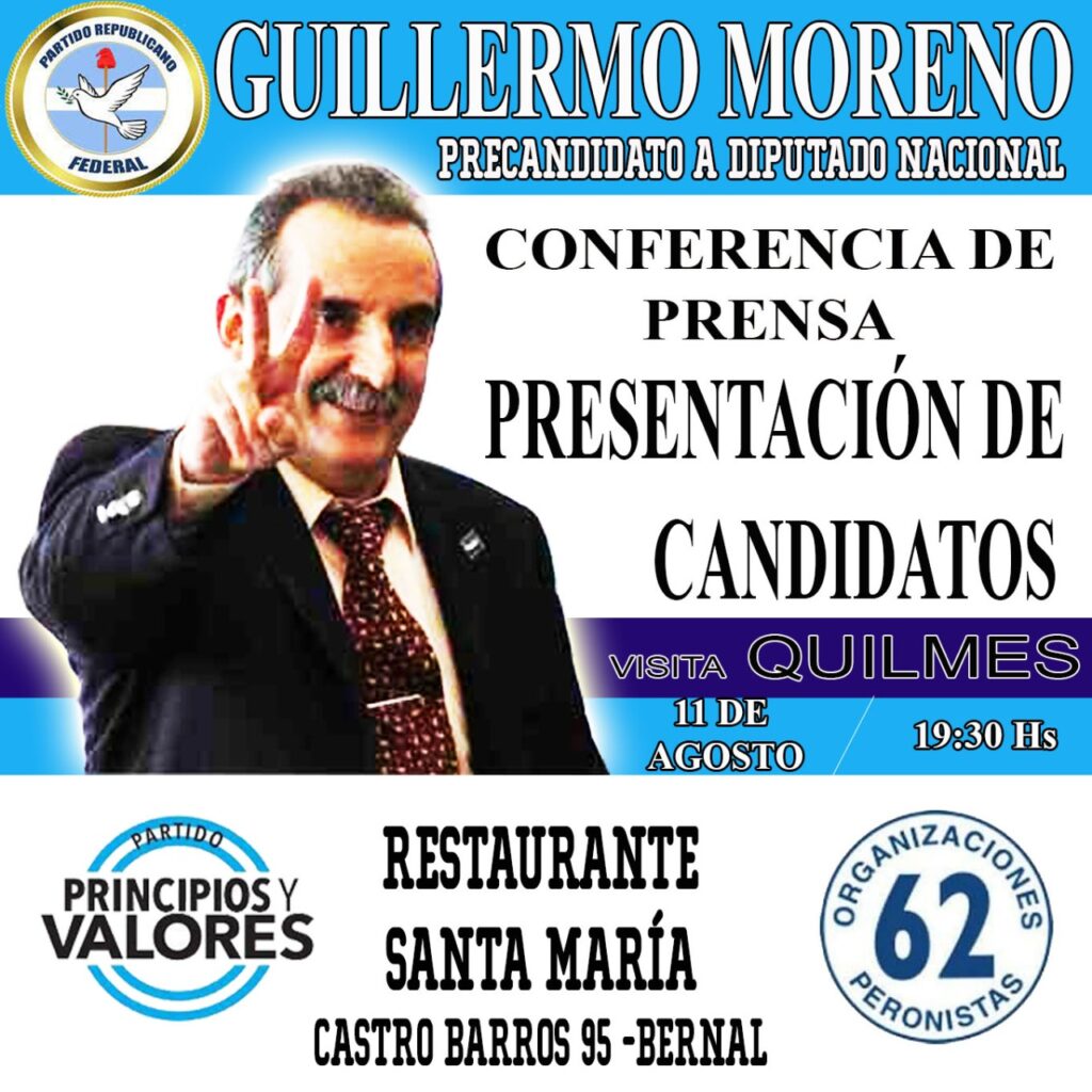 Hoy, el ex secretario de Comercio Interior Guillermo Moreno presentará a sus precandidatos locales, por el Partido Republicano Federal con la lista Principios y Valores.