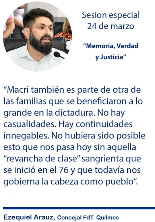 “Este 24 de marzo debe ser una jornada de reflexión, hoy los concejales pusieron en voz el sentimiento que nos atraviesa a todos, es el análisis de la historia reciente de nuestro país, pero además de lo que esa dictadura dejó en cada uno, de la represión, de las víctimas, de las atrocidades cometidas por los genocidas que un día decidieron no solo tomar el poder sino también tomar la vida de nuestros compatriotas, por eso a 46 años del golpe militar los que componemos el Cuerpo quisimos hacer este homenaje, por todas esas víctimas que no están y por los que aún hoy siguen la lucha por la verdad y la justicia”