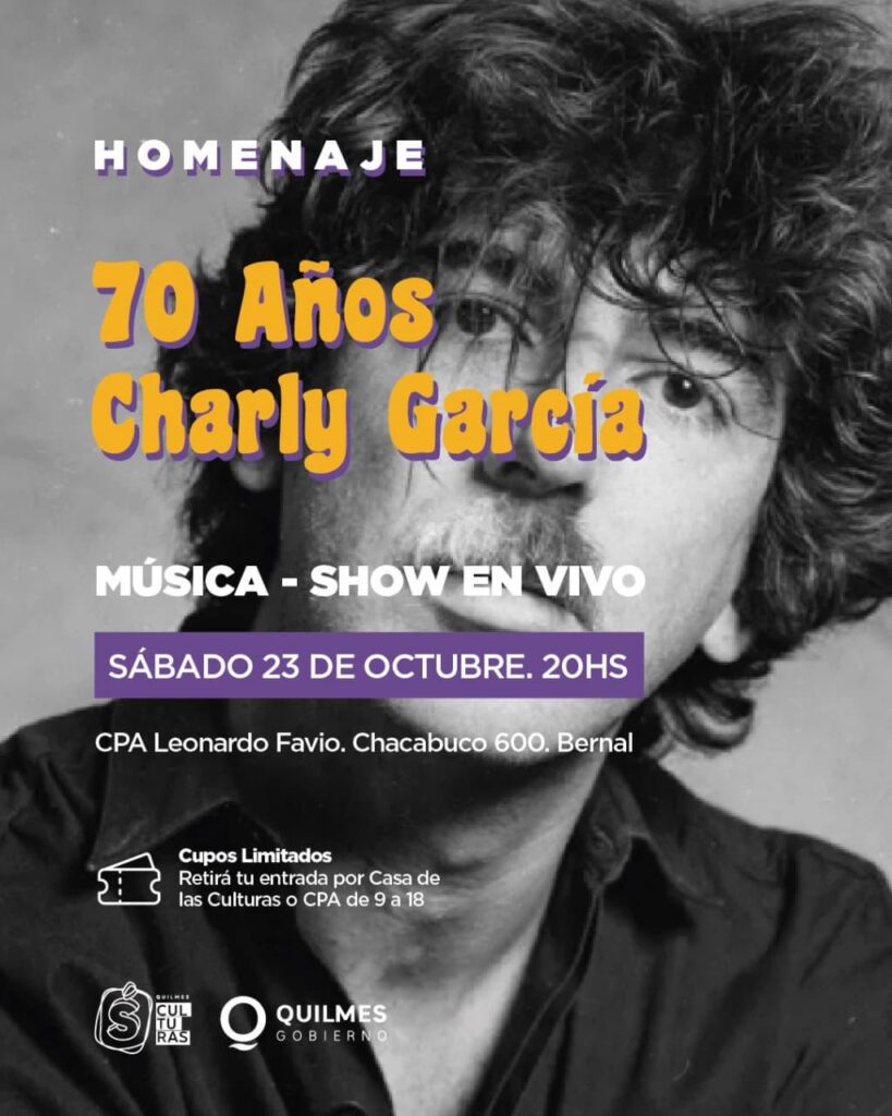 El Municipio invita al homenaje a Charly García, este sábado 23 de octubre a las 20, en el CPA (Centro de Producción Audiovisual) Leonardo Favio, en Chacabuco 600, en Bernal, con entrada libre y por orden de llegada (hay cupos limitados).