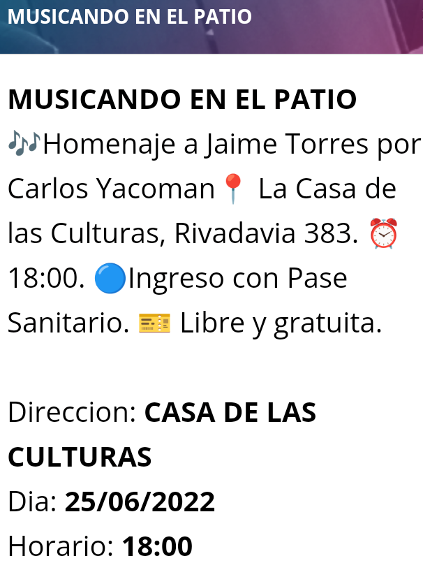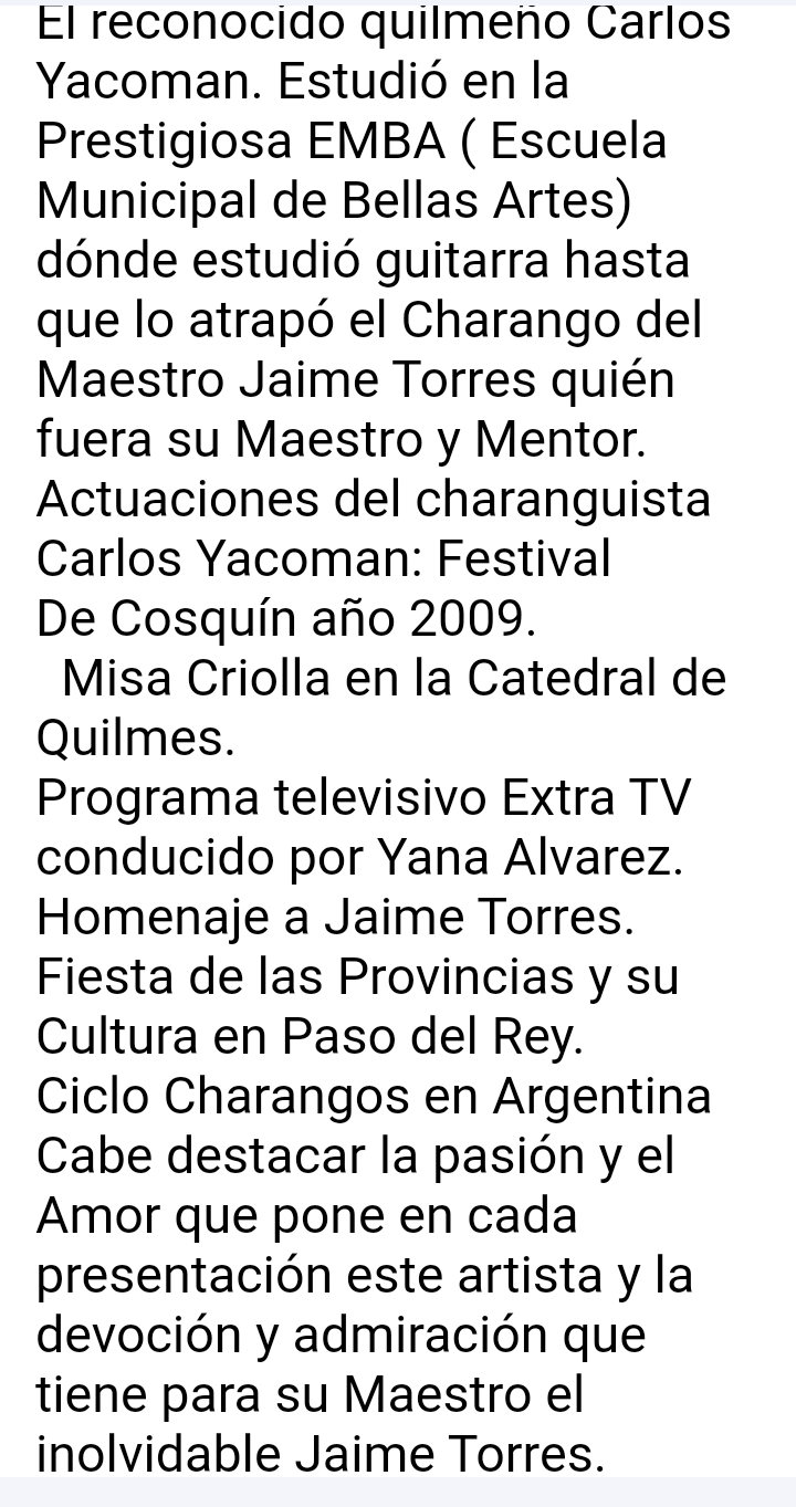 Cultura/Educ. HOMENAJE A JAIME TORRES Alberto Moya 14 de junio de 2022 No hay comentarios (CIQ) ¿Qué mejor que un concierto de charango para rendir homenaje a Jaime Torres? Así lo hará Carlos Yacomano, el sábado 25 de junio a partir de las 18 en el Palacio de la Casa de la Cultura, Rivadavia y Sarmiento.