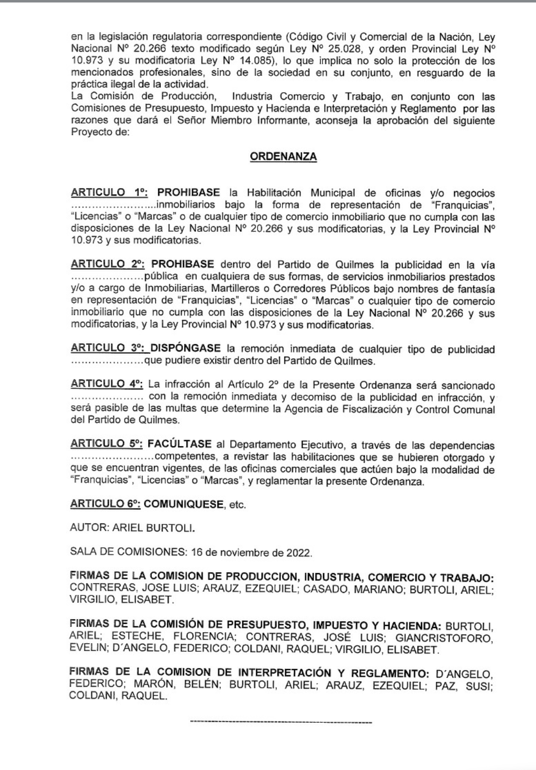 La norma prohibe además “la publicidad de servicios inmobiliarios bajo el nombre de franquicias dentro del partido de Quilmes”, y dispone su “remoción inmediata y decomiso de la publicidad en infracción y la sanción de multas”.