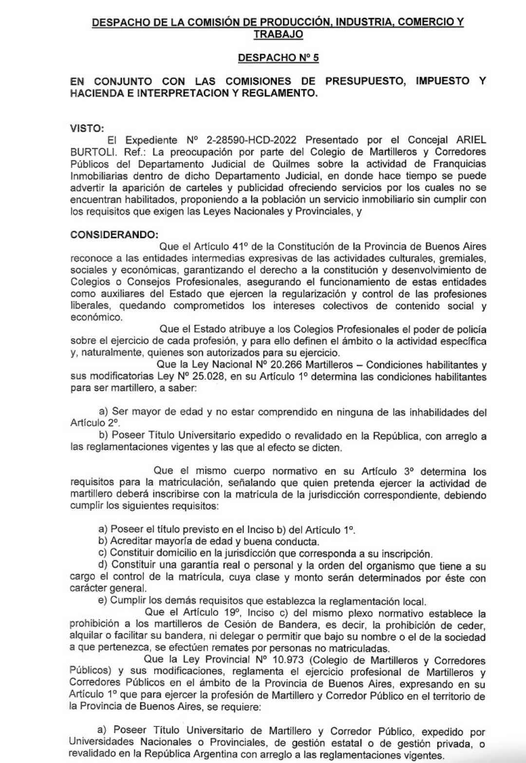 El proyecto de ordenanza presentado por el concejal Ariel Burtoli fue aprobado en el recinto con la presencia de Alfredo Lavalle, presidente del Colegio de Martilleros y Corredores Públicos del Departamento Judicial Quilmes, acompañado por integrantes del Consejo Directivo de la institución y martilleros de la región.