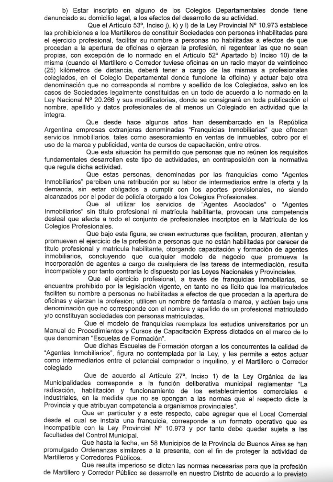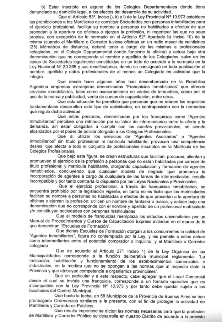 La nueva ordenanza “prohíbe la habilitación municipal de oficinas inmobiliarias bajo la forma de representación de Franquicias, licencias o marcas o cualquier tipo de comercio inmobiliario que no cumpla con las disposiciones de la Ley Nacional Nº 20.266 y sus modificatorias, y la Ley provincial Nº 10.973 y sus modificatorias”.