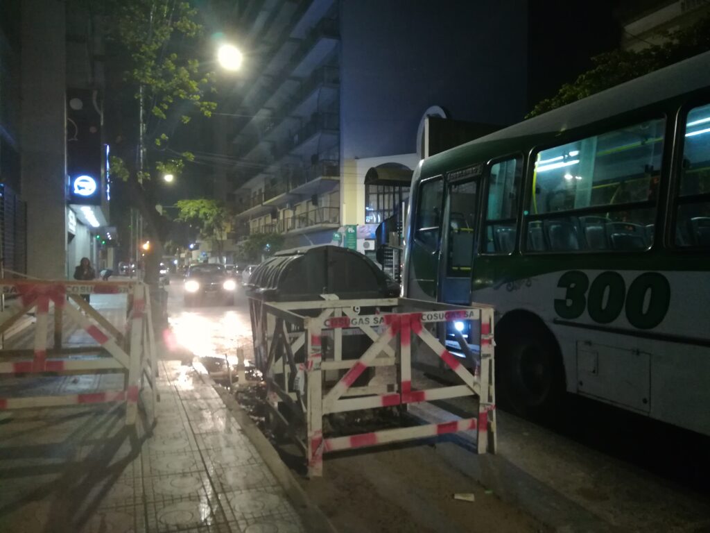 Completa el cuadro el pavimento roto por una empresa tercerizada y el contenedor de residuos que espera a ser vaciado.