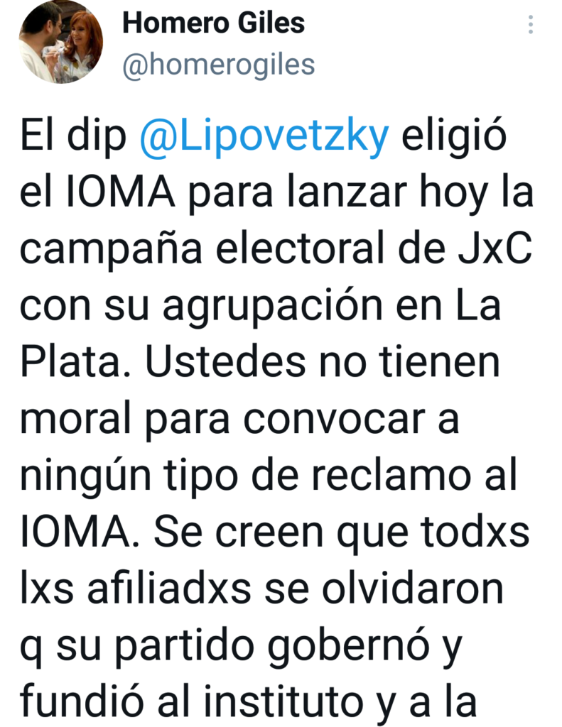 Desde 2018 las instituciones que asisten a personas con discapacidad se encuentran en situación de abandono por parte del Instituto Obra Médico Asistencial (IOMA), la mayor cobertura médica de la provincia para afiliados obligatorios y voluntarios según convenios. Su director actual es Homero Giles, médico formado en Cuba, militante de la agrupación La Cámpora. Dice en sus redes que la oposición hace campaña desde la institución que fundió durante la gestión anterior: