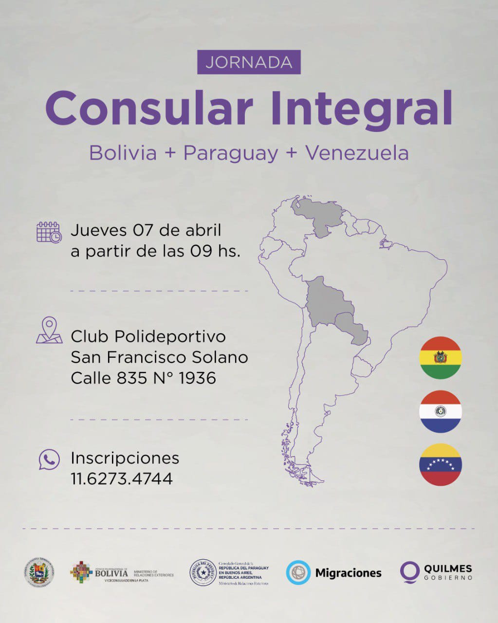 El jueves 7 de abril se llevará a cabo una Jornada Consular Integral de Bolivia, Paraguay y Venezuela en el Club Polideportivo San Francisco Solano (calle 835 Nº 1936), organizada por la Municipalidad y la Dirección Nacional de Migraciones. El objetivo es brindar un espacio de asistencia, asesoramiento y realización de trámites consulares y migratorios para los vecinos de Quilmes migrantes, quienes deberán inscribirse por Whatsapp al 1162734744.