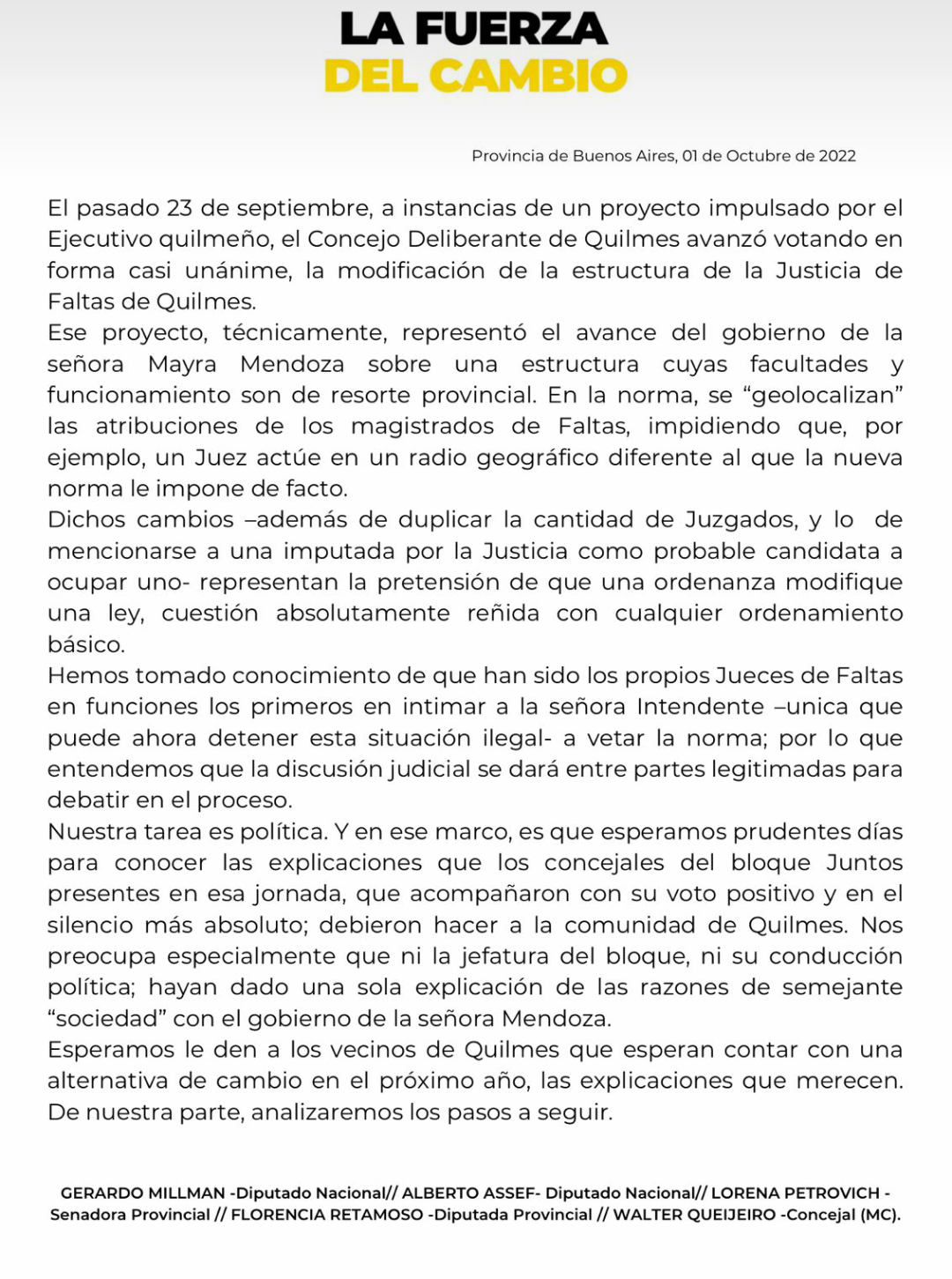 Los legisladores firmantes del pedido son los diputados nacionales Gerardo Millman y Alberto Assef; la senadora provincial Lorena Petrovich; la diputada provincial Florencia Retamoso y el ex concejal Walter Queijeiro.