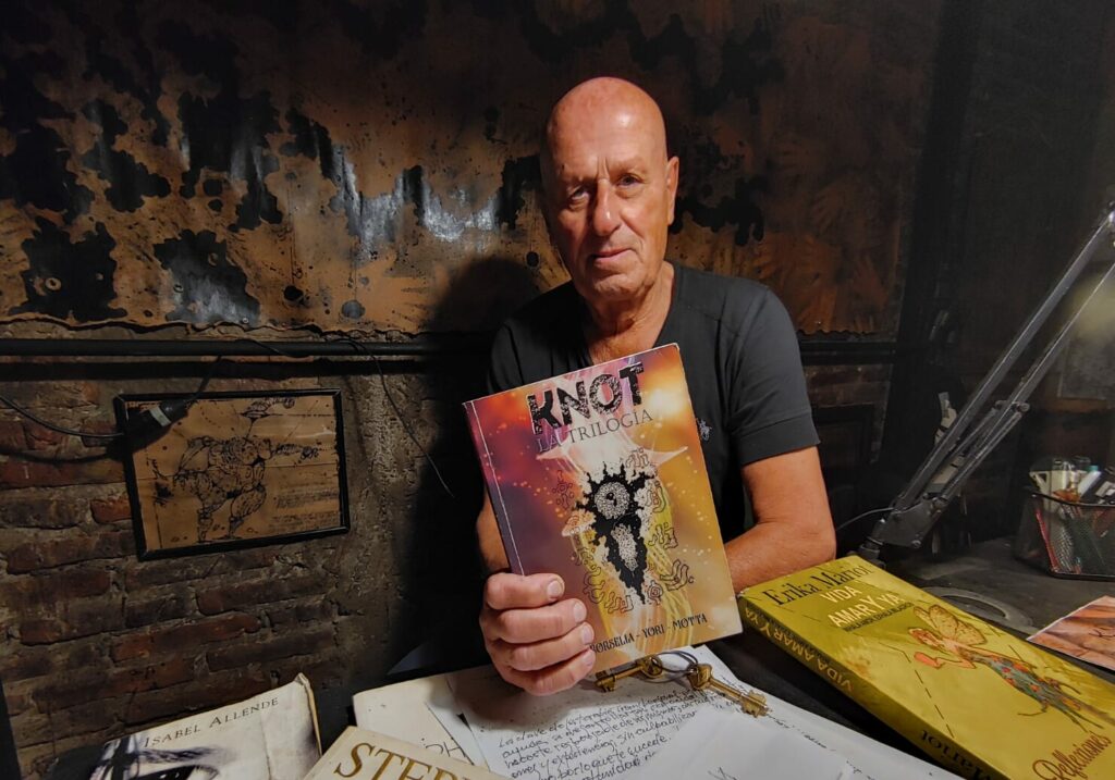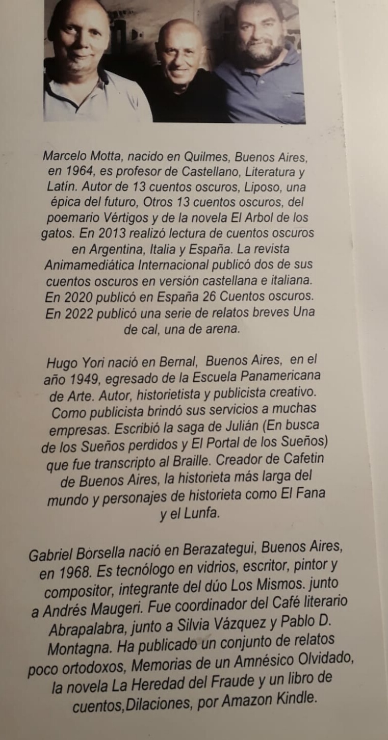 En el estudio de Yori nació la idea de entrelazar sus figuras en un relato fantástico, se lo propuso a dos escritores, también locales, de gran trayectoria, Marcelo Motta y Gabriel Borsella.