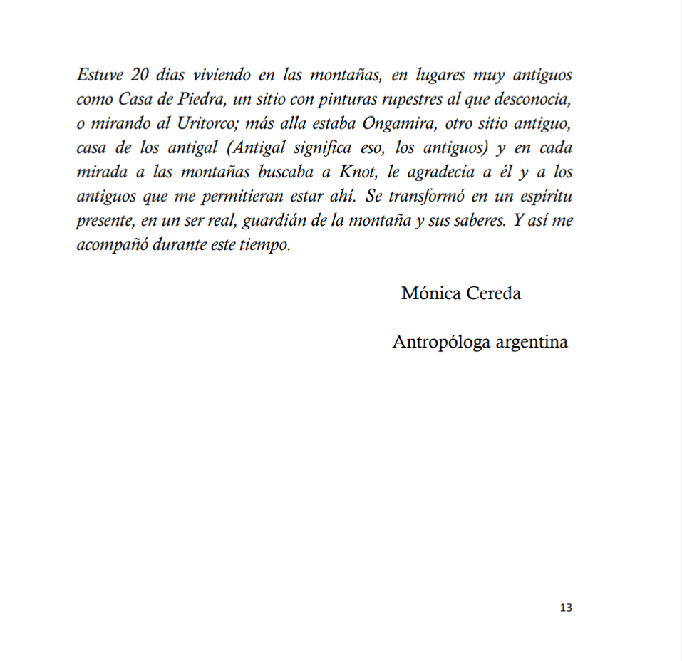 Sus cóndores, arquetipo de Los Andes, aparecen en su nueva obra, Knot, la trilogía, para recordar a la humanidad que hubo un origen del ser, en el que estaba vinculado a la tierra en respeto y común unión, y cómo se perdió ese lazo por la avidez de cambiar el ser por el tener.