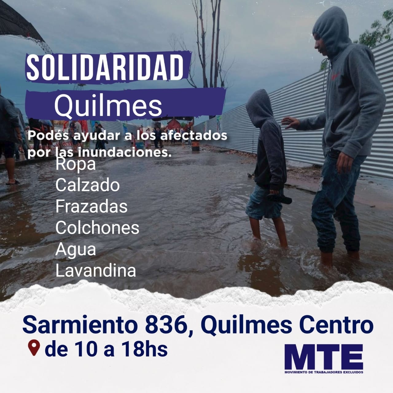 Una nueva tormenta nos deja baja agua perdiendo lo poco que tenemos. Muchos barrios de Quilmes se encuentran bajo agua por lo que pedimos: ropa, calzado, frazadas, colchones, agua mineral, elementos de limpieza. Si tenés algo de esto, podés acercarlo a SARMIENTO 836, Quilmes, entre las 10 y 18hs o comunicarte al: 1136117980