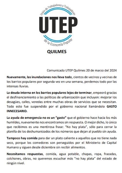 Necesitamos respuestas, comida, agua potable, chapas, ropa, frazadas, colchones, obras, no queremos escuchar más “no hay plata” del Estado de ningún nivel.