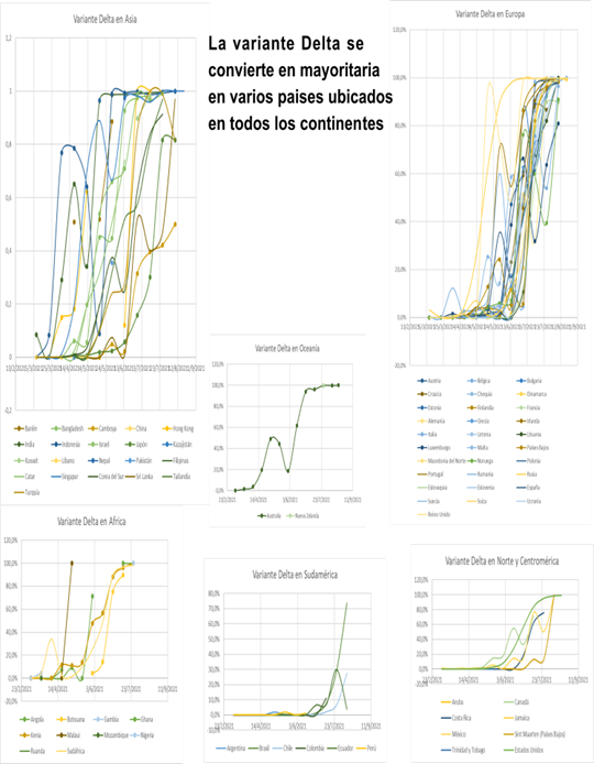 En otros países y en todos los continentes, la variante delta se convirtió en la de abrumadora mayoría en apenas 4 a 6 semanas después que se demostrara su transmisión comunitaria y atravesara el umbral de ser detectada en el 1% de los casos totales.