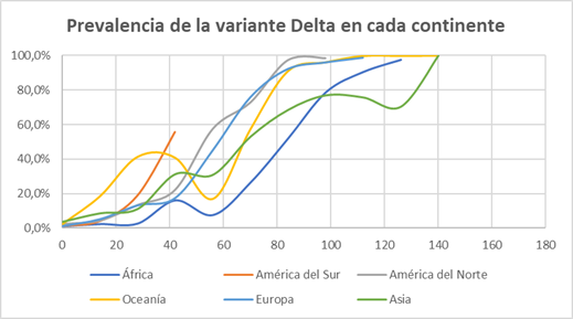 Podemos ver la prevalencia de la variante Delta expresada en porcentaje de los casos totales, por continente. Los datos fueron graficados en función del tiempo (en días) y fueron alineados en el día cuando la variante delta superó el 1% del total de casos en cada continente.