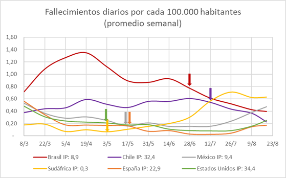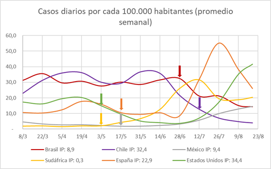 Antes del ingreso de Delta, los países con un índice de protección intermedio (EEUU, España, Chile) los casos diarios disminuían y en los países con índice de protección baja o muy baja la situación era estable (Sudáfrica, México), o al inicio de un descenso (Brasil).