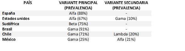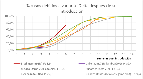 Después que la variante Delta pasó el umbral del 1% de los casos registrados, demoró sólo 4 ó 5 semanas para llegar al 20% de prevalencia en México, Sudáfrica, España y Estados Unidos, y 8 a 10 semanas para superar el 80%.