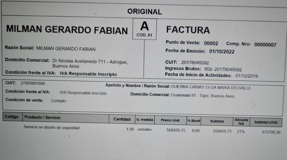 También aparece una factura A dirigida a Olga María del Valle Guerra Carias, fechada el 1 de octubre 2022 por 675.700 pesos, con un detalle llamativo: “Servicio de diseño de seguridad”. Guerra Carias es una venezolana de 35 años que en agosto de 2021 se inscribió en AFIP y declaró ingresos de hasta 25.000 pesos en el rubro «grabación de sonido y música». Desde entonces, generó una deuda de 45.000 pesos que está en instancia judicial con una pequeña financiera que le otorgó un préstamo mínimo.