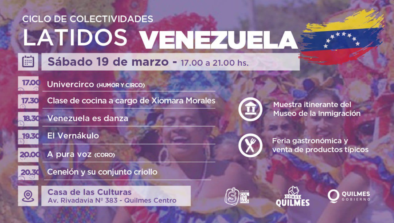 Cultura/Educ. Gestion Municipal LATIMOS AL RITMO DE VENEZUELA Augusto Macario 18 de marzo de 2022 No hay comentarios Sábado 19/3 Somos el Quilmes que queremos.compartimos y disfrutamos de las Artesanías, Las Danzas y Las Comidas Típicas de los hermanos Venezolanos De 17 a 21 hsRivadavia 383 Quilmes
