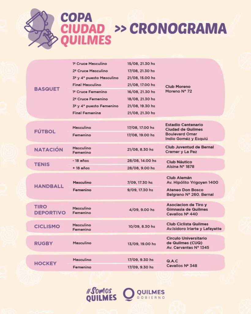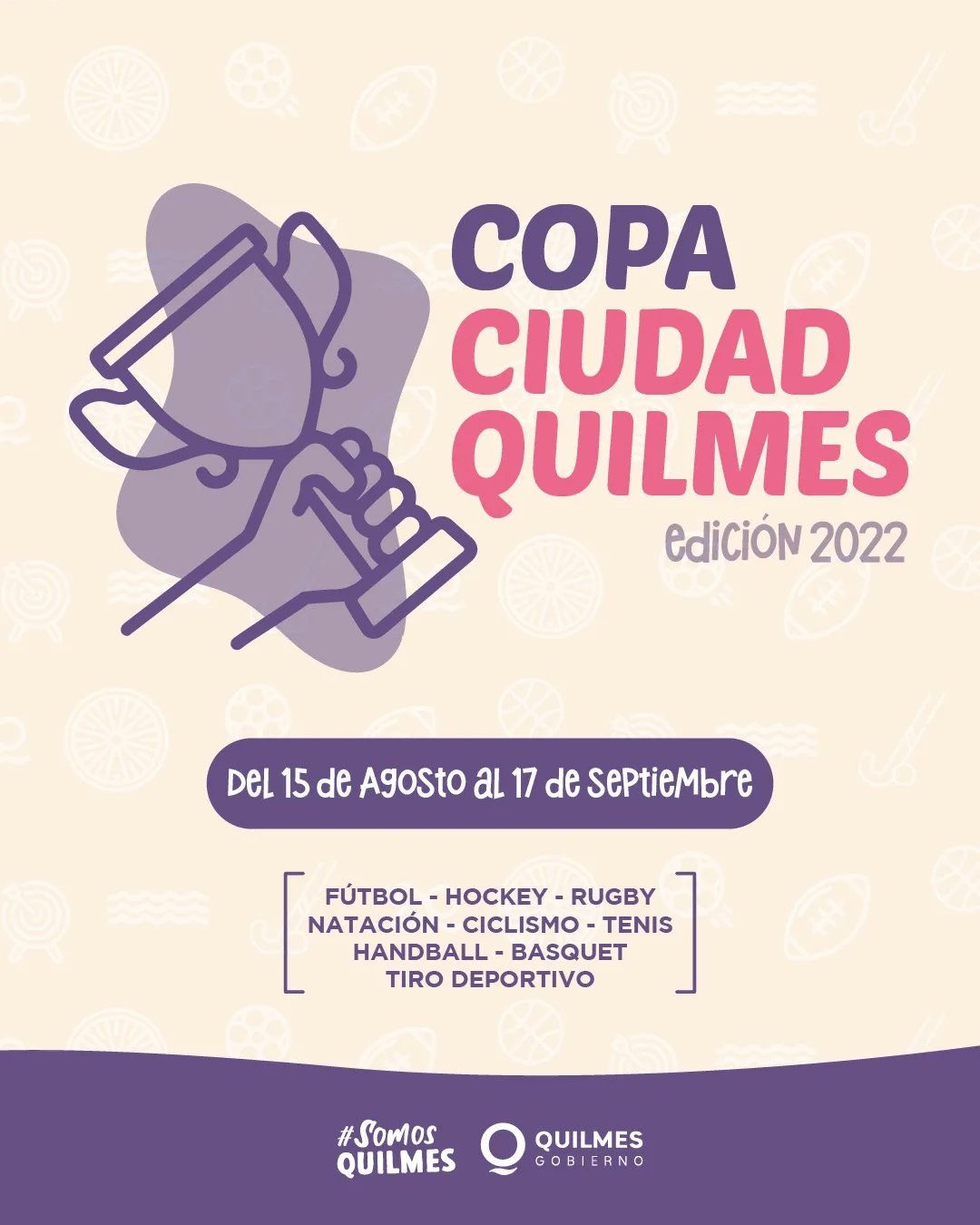 El Municipio informa que en el marco de los festejos por el 356º aniversario de la ciudad, desde el lunes 15 de agosto hasta el 17 de septiembre, se desarrollará la «Copa Ciudad de Quilmes», con entrada libre y gratuita, en diferentes disciplinas deportivas, como fútbol, natación, hockey, básquetbol, tenis, handball, tiro deportivo y ciclismo (todas ellas con equipos masculinos y femeninos), y rugby