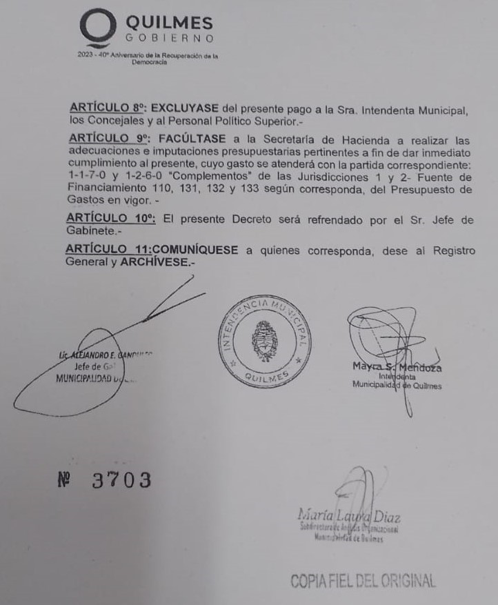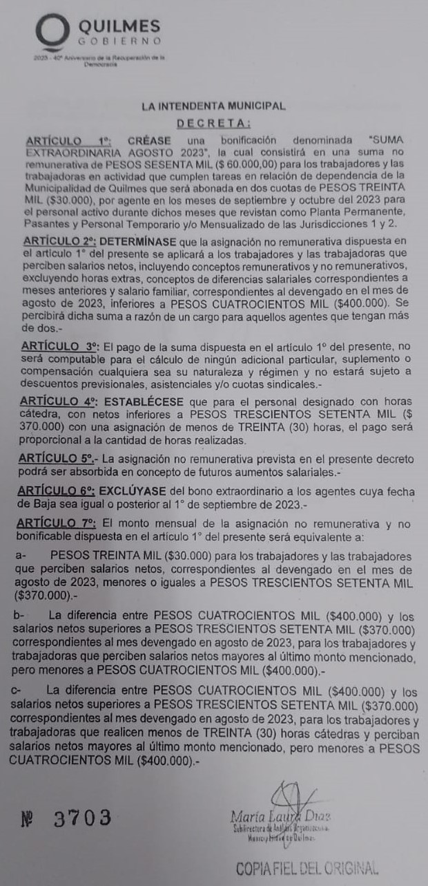 Gestion Municipal Gremiales LOS MUNICIPALES TENDRAN EL BONO Alberto Moya 13 de septiembre de 2023 No hay comentarios Verónica Martin La decisión anunciada por el ministro de Economía Sergio Massa halló rápido eco en la Municipalidad de Quilmes con la firma de este decreto dispuesto por orden de la Jefa comunal Mayra Mendoza: