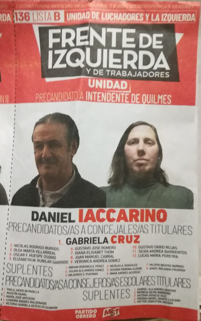 Continúa su lista con Cristian Florentino, Adriana Martínez, Guido Maiani(de Izquierda Socialista), Graciela Monje, de SUTEBA, Carlos Torres Musante, del PTS, docente, esposo de Carla Lacorte, luchadora de DDHH, víctima de gatillo fácil.