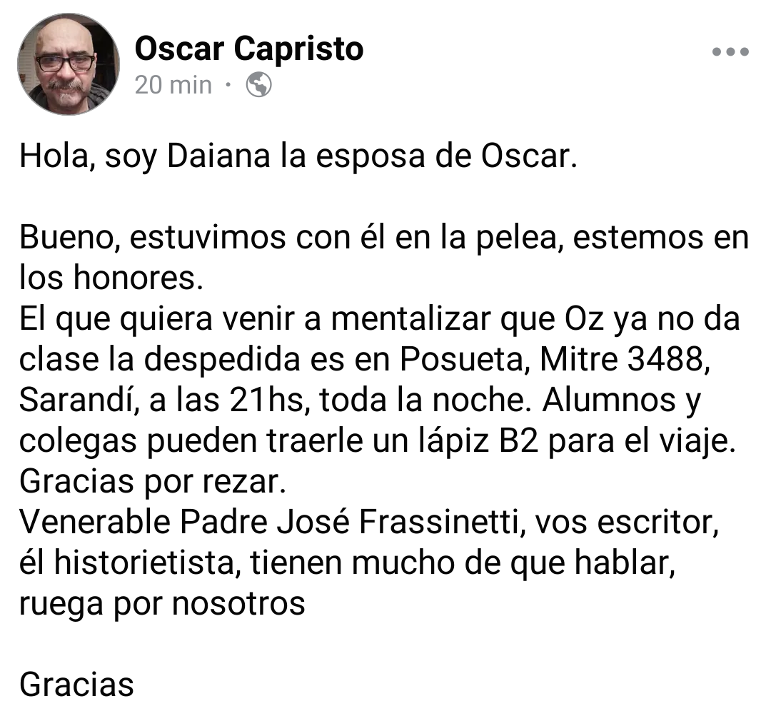 Su compañera de vida invita a despedir sus restos, porque los afectos son eternos: