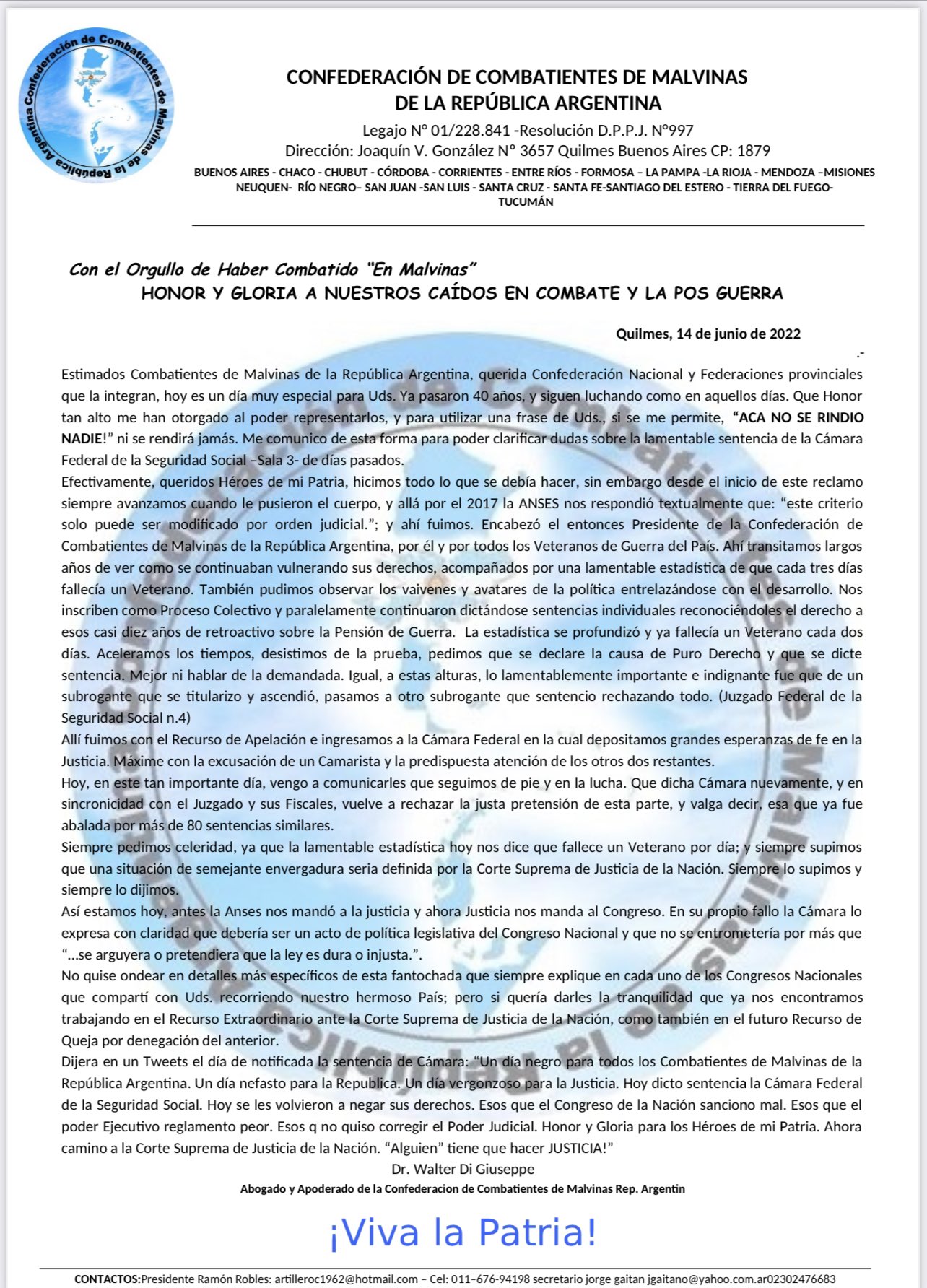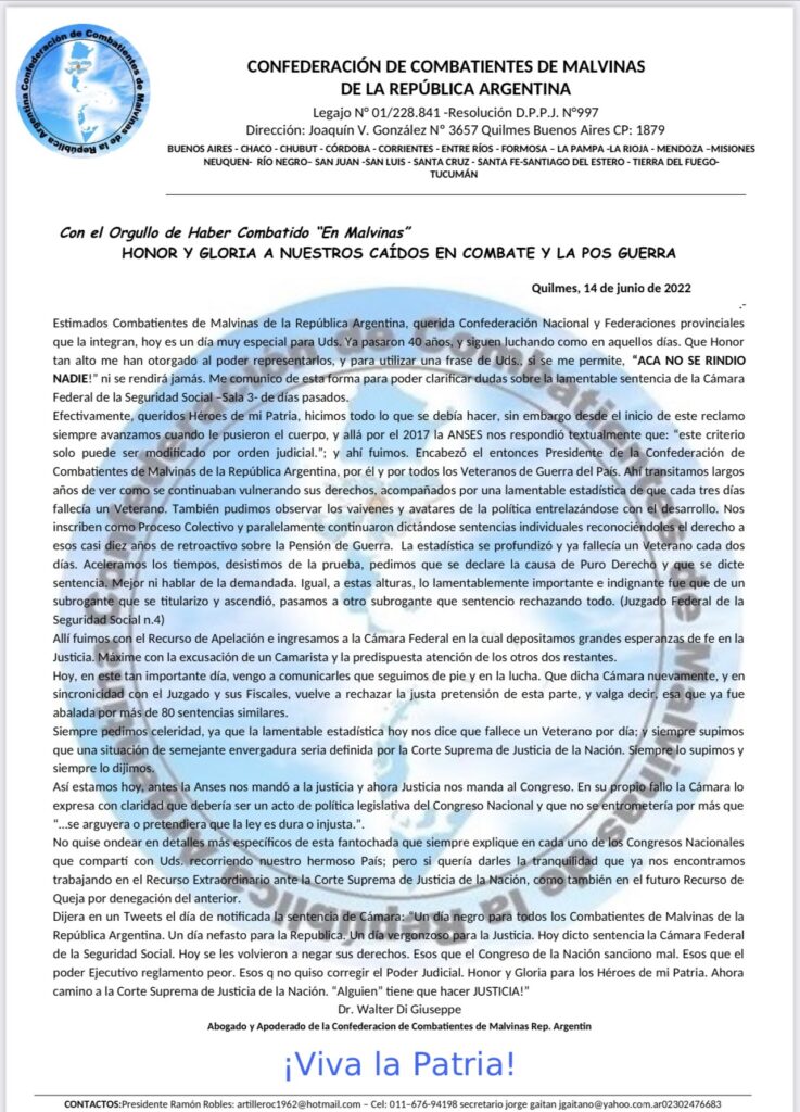 Adjuntó el comunicado oficial sobre el reclamo judicial del retroactivo de la Pensión de Guerra: