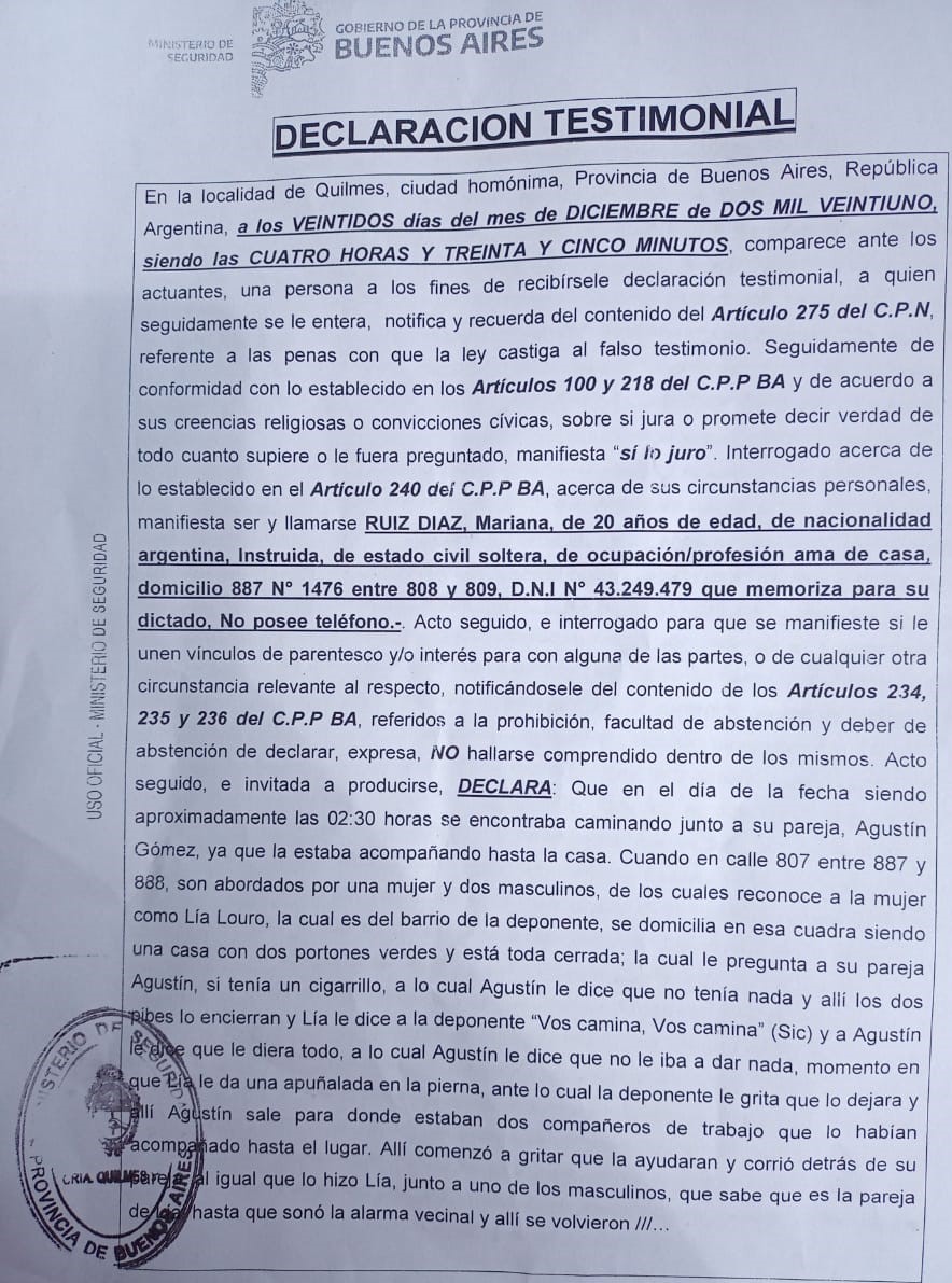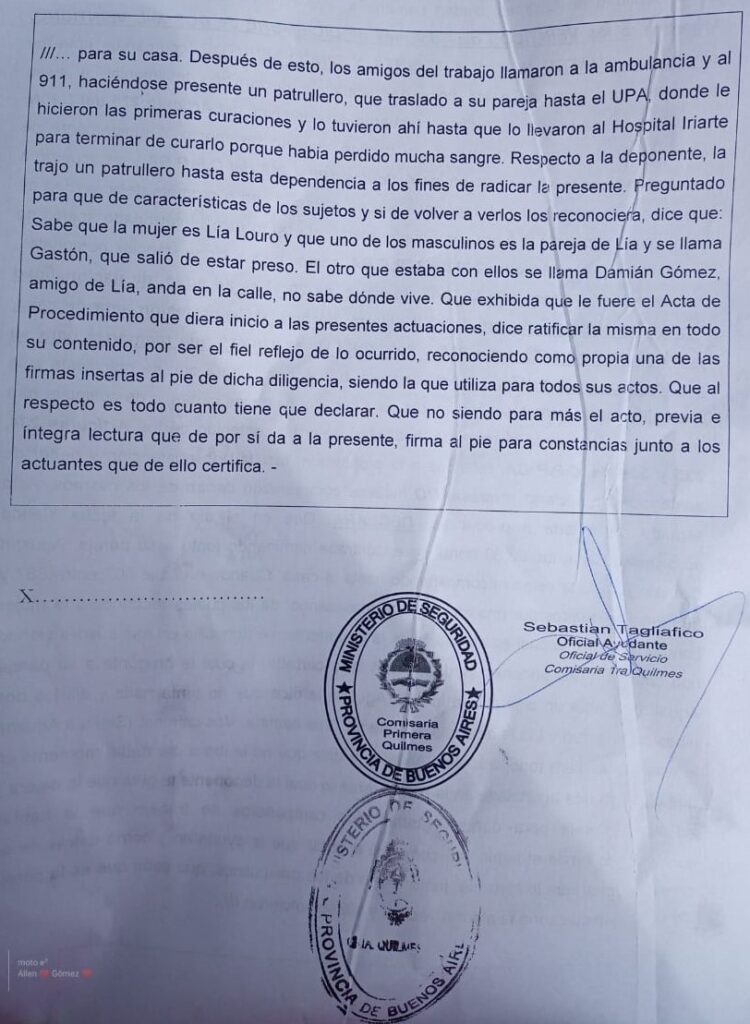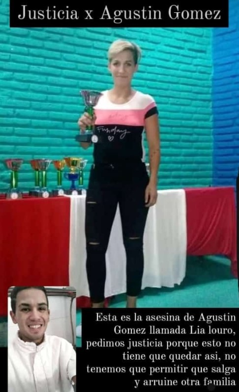El de 22 de diciembre a las 2:20 de la madrugada, mi hermano recibió una puñalada en la pierna por parte de una chica, Lía Louro, de unos 30 años, que lo agarró a traición y le clavó una cuchilla. Le echaba la culpa a mi hermano de algo que no fue. Mi hermano estaba con mi cuñada, embarazada de siete meses. Esa mina que mató a mi hermano es tranza y consume. Mató a mi hermano y a otro chico que no tenía nada que ver. Quiero hacer justicia por él para que ella pague por lo que hizo. Dejó a una familia destrozada y a dos chicos sin su papá. Quiero que se haga viral por favor. Ella está en la Seccional 6a, de Ezpeleta, pero tememos que salga. Nos amenazó de muerte a toda mi familia.