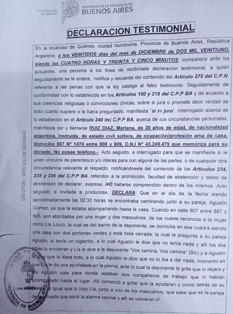 Esta es la primera declaración testimonial con otro relato, más extenso: