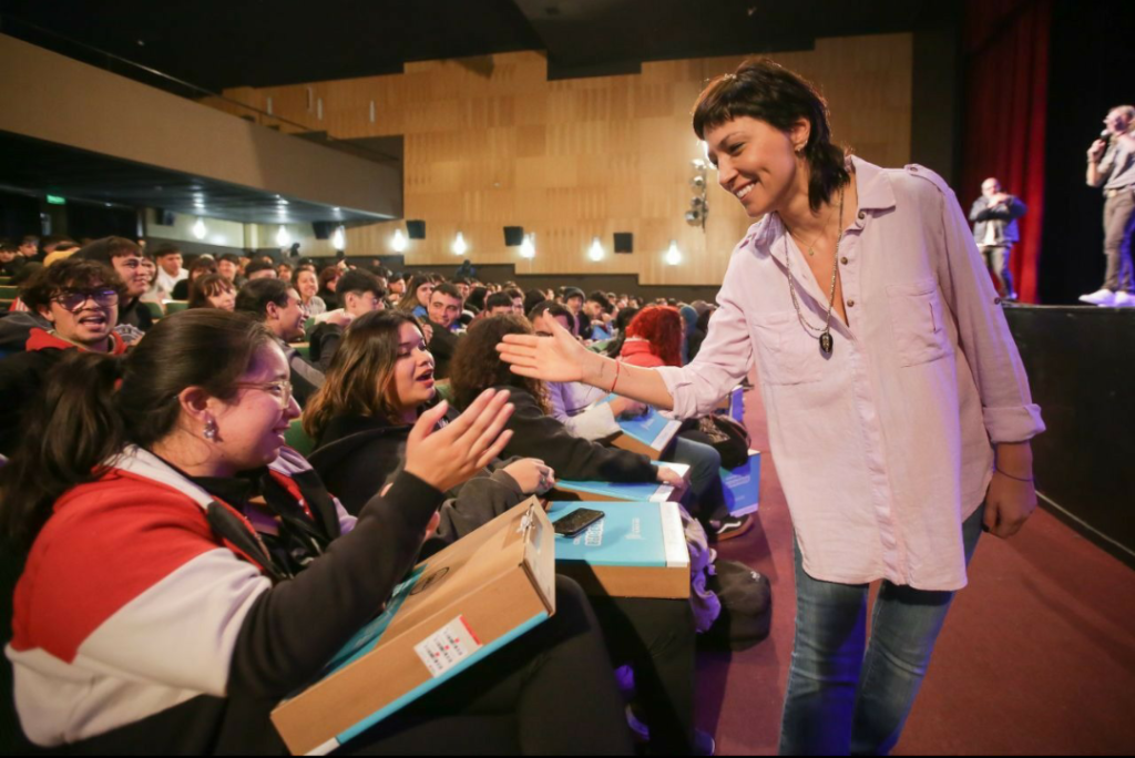 La jefa comunal, el jefe de Gabinete de la Dirección General de Cultura y Educación provincial, Pablo Urquiza, el secretario de Educación local, Joaquín Desmery, y la directora general de Juventudes, Ana Palacios, encabezaron este lunes la entrega de netbooks a alumnos de 6º de ocho secundarias del distrito, en el marco del programa Conectar Igualdad, en el Teatro Municipal.