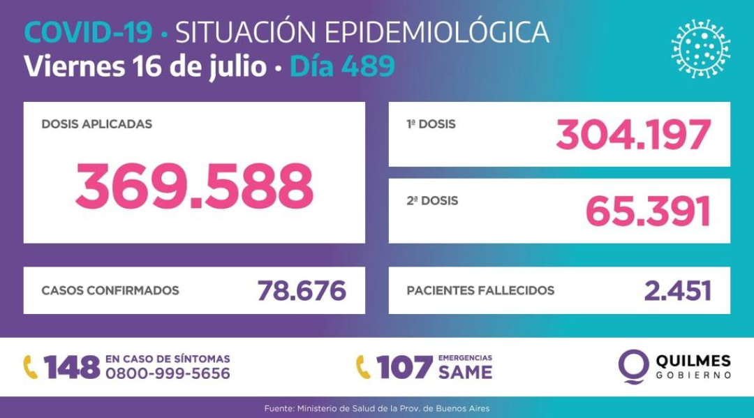 Se invita a todos aquellos que no se hayan vacunado y sean mayores de 35 años, a cualquiera de las 12 postas de vacunación que hay en Quilmes. Además, se desarrolla una estrategia complementaria a las 12 postas fijas de vacunación, en la estación de Quilmes y en clubes de barrio para seguir acercando la vacuna al vecindario.