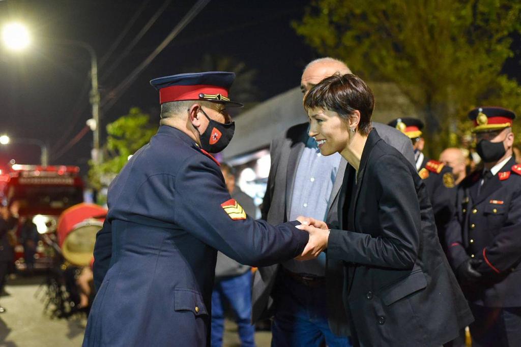 Mayra Mendoza visitó en la tarde de este sábado el Cuartel de Bomberos Voluntarios de Quilmes, en Guido 87, en el que entregó un cheque simbólico por un subsidio de más de 5 millones de pesos, y luego fue a la plaza Yapeyú, en calle 893 esquina 845, frente a la entrada del Cuartel de Bomberos Voluntarios de San Francisco Solano, donde se inauguró la primera escultura de Sudamérica que destaca a una bombera, y que homenajea a trabajadores y trabajadoras de la institución.
